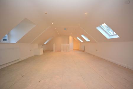 Velux to rear, panelled bath with mains shower and shower screen, extractor fan, vanity wash hand basin, low level WC, fully tiled walls, heated towel rail, tiled flooring.