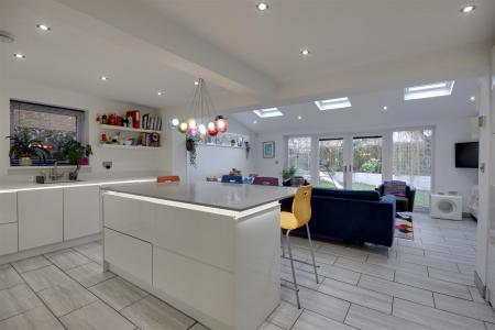 Living Kitchen - An open plan extended kitchen/diner and sitting room. Electric underfloor heating and dimmer LED spot lights fitted.