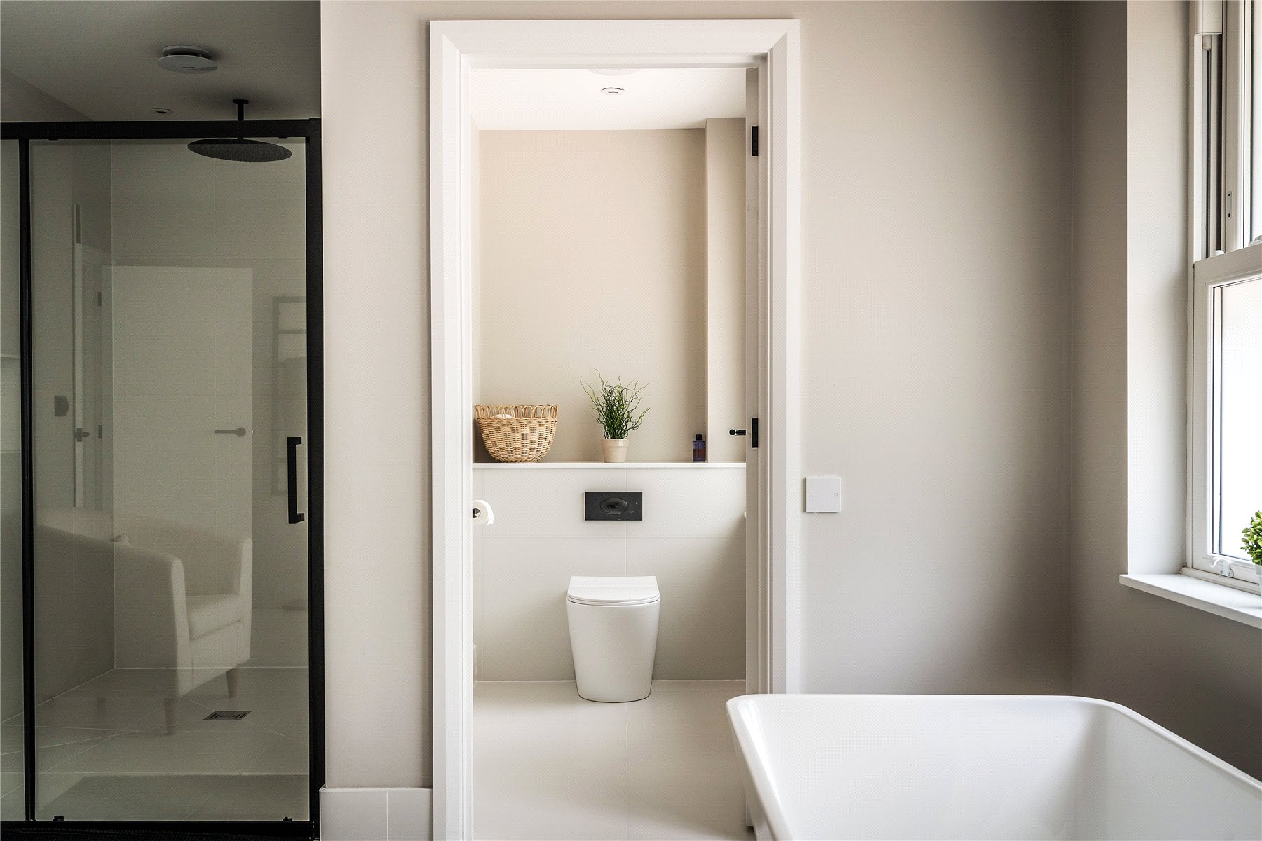 Generating a hugely cohesive home, upstairs the palette of warm muted tones is once again peppered with matte black detailing and paired with the greenery of garden vistas. Wrapping around the galleried landing of the first floor, three light filled double bedrooms each have deluxe en suites. Extending out across the full depth of the property, an immense principal bedroom creates its own wing of the house. Graceful yet ultimately luxurious it has an integrated speaker system, a wonderfully large immaculately fitted dressing room, and a vast en suite where a contemporary freestanding bathtub adds a superb centrepiece. A floating console of twin basins framed by a duo of ladder radiators lends symmetry, a walk-in shower has a ceiling mounted waterfall head, and a WC sits discreetly hidden behind a door.
