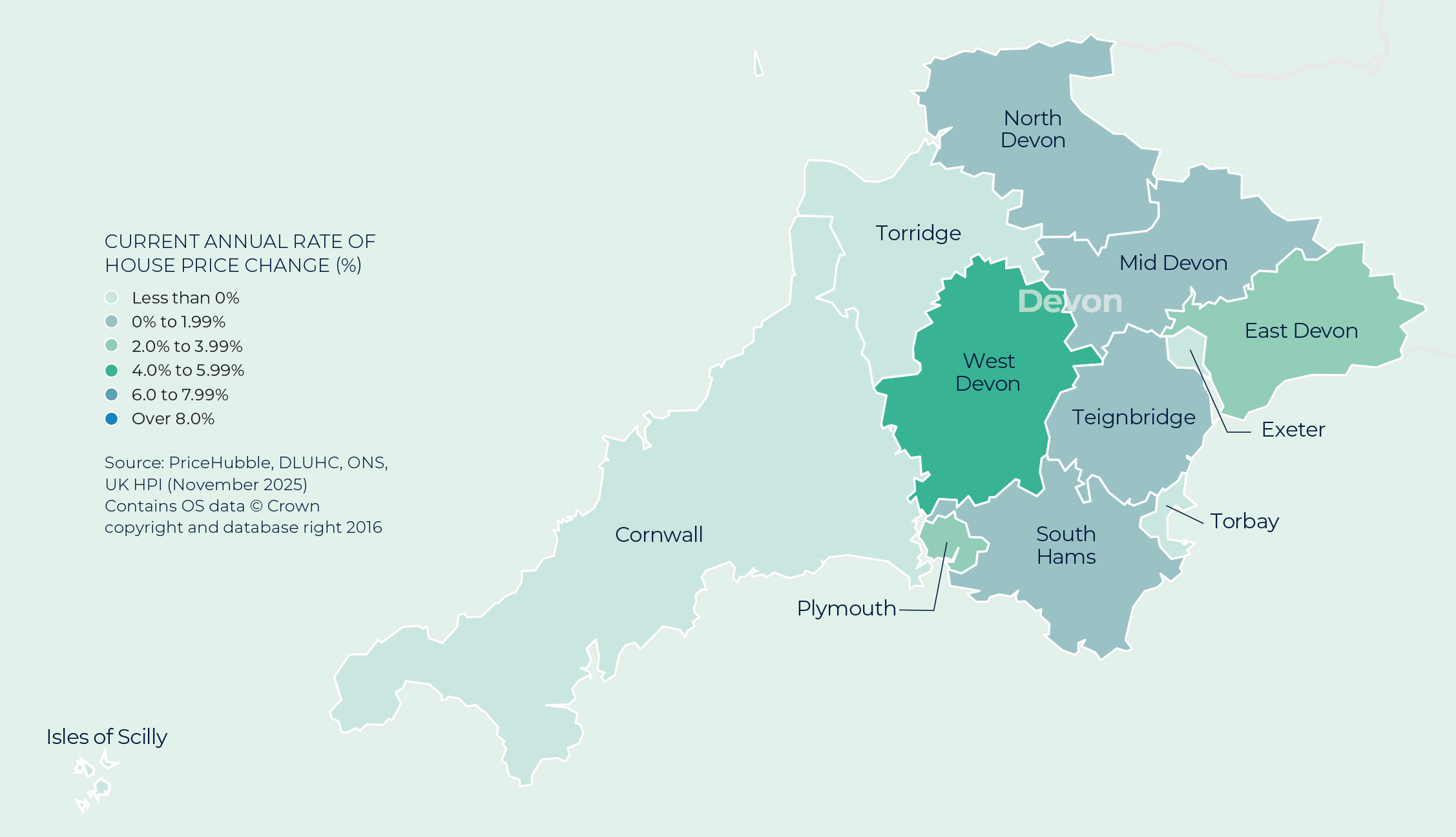 2026 began with the highest level of homes for sale in over eight years, with the average agent marketing 32 properties (Zoopla). Around a third of these homes were previously listed in 2025 and have since returned to the market after uncertainty late last year dampened activity. The uplift in supply is most pronounced in southern England, where listings in London were up 16% year on year and the South East saw a 9% increase. House price growth remains linked to supply, with increased availability moderating growth by giving buyers more choice and greater negotiating power. As always, local pricing can differ significantly from national trends. Average property values in the region were up 1.9% on last year’s levels. Strongest price growth was evident in West Devon (5.0%), a margin ahead of the next top performers City of Plymouth (2.3%) and East Devon (2.1%).
