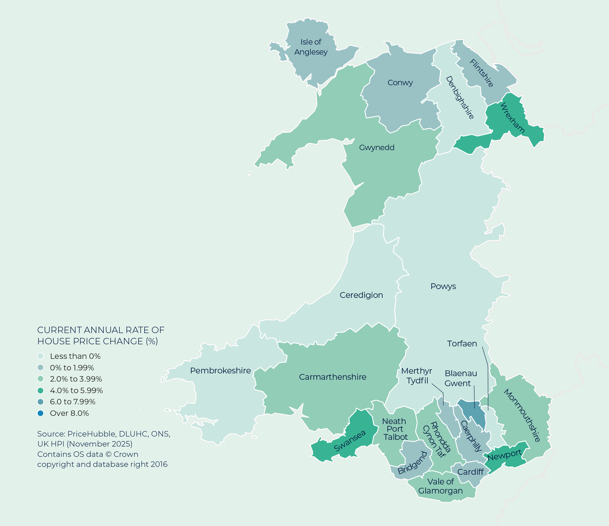 2026 began with the highest level of homes for sale in over eight years, with the average agent marketing 32 properties (Zoopla). Around a third of these homes were previously listed in 2025 and have since returned to the market after uncertainty late last year dampened activity. The uplift in supply is most pronounced in southern England, where listings in London were up 16% year on year and the South East saw a 9% increase. House price growth remains linked to supply, with increased availability moderating growth by giving buyers more choice and greater negotiating power. As always, local pricing can differ significantly from national trends. Average property values in the region were up 0.7% on last year’s levels. Strongest price growth was evident in Blaenau Gwent (6.7%), a margin ahead of the next top performers Swansea (5.1%) and Wrexham (5.0%).