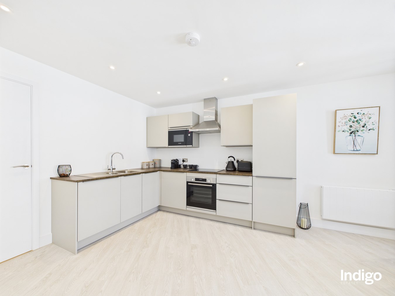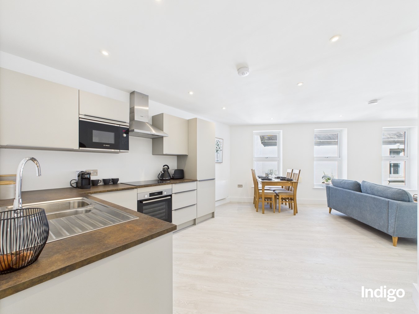 The open-concept living area seamlessly connects kitchen, dining, and lounge spaces, perfect for modern living and entertaining. Kitchens are beautifully fitted with Symphony Gallery Inline Urban units, antique bronze-look worktops, and integrated Bosch appliances.