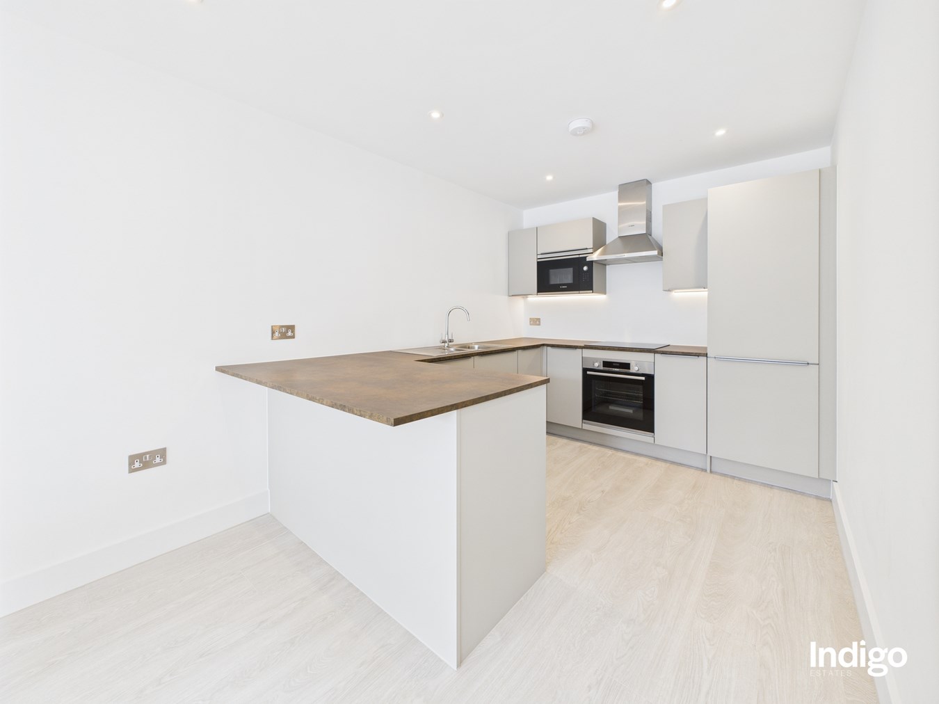 The open-concept living area seamlessly connects kitchen, dining, and lounge spaces, perfect for modern living and entertaining. Kitchens are beautifully fitted with Symphony Gallery Inline Urban units, antique bronze-look worktops, and integrated Bosch appliances.