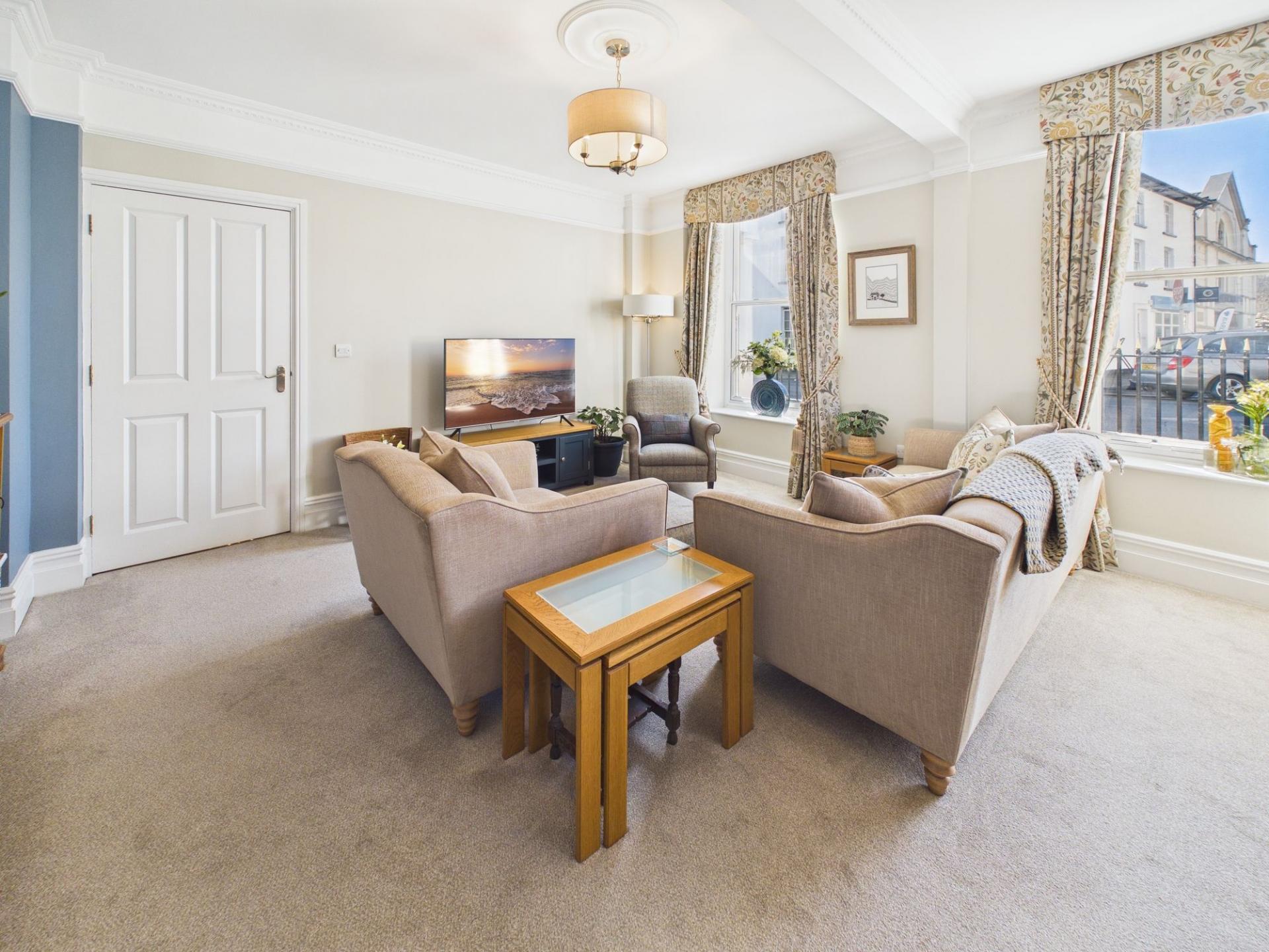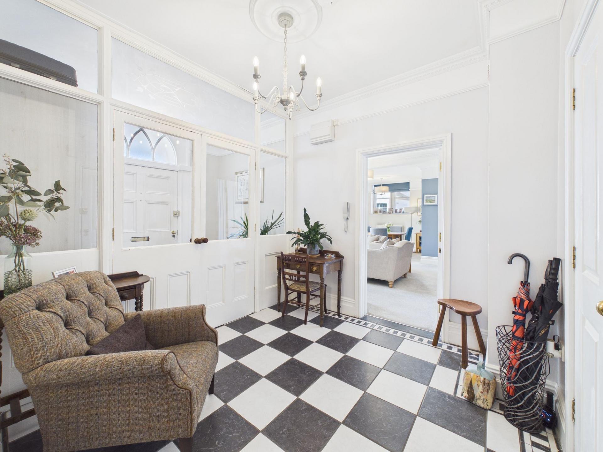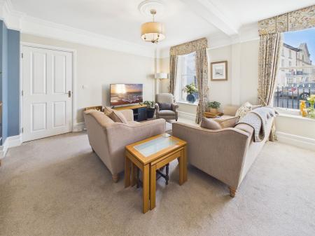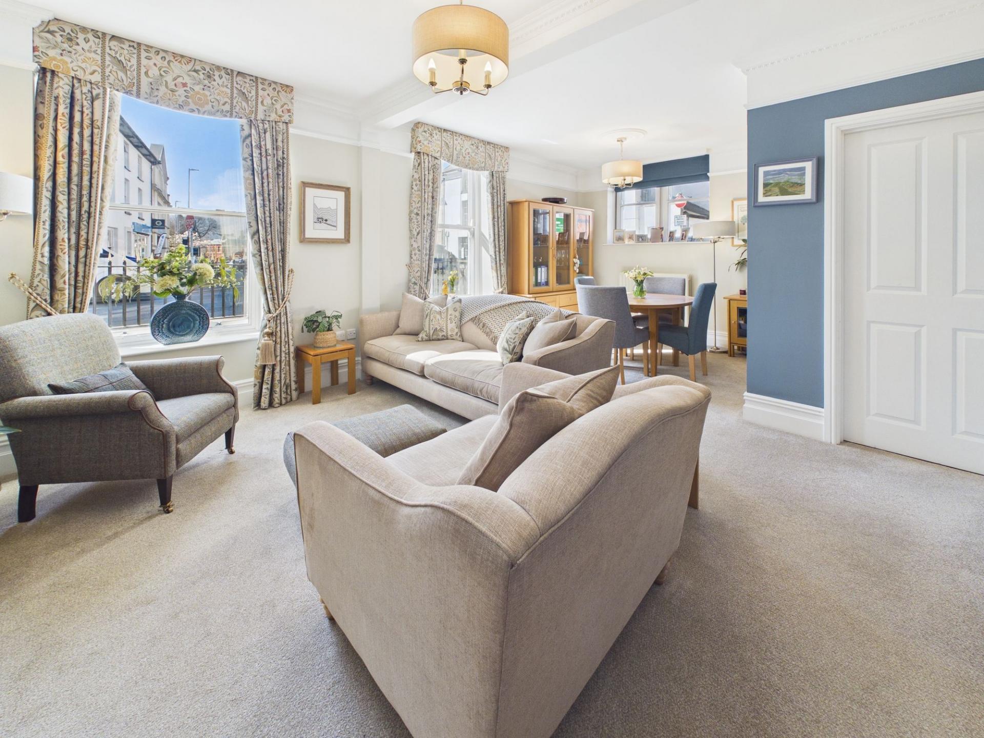 Beautifully presented and located in a prime position at the very heart of the internationally famous market town of Abergavenny, is this grand three bedroom ground floor apartment, situated in a much sought after Grade II Listed development in the centre of the conservation quarter.  Occupying a substantial part of the ground floor, the apartment presents to three sides of this historic 18th Century Residence and enjoys generous proportions extending to over 1000 sq ft, high ceilings and character features including a grand porch with Tuscan columns, sash windows, cornice ceilings, picture rails and an original fireplace to one of the bedrooms.