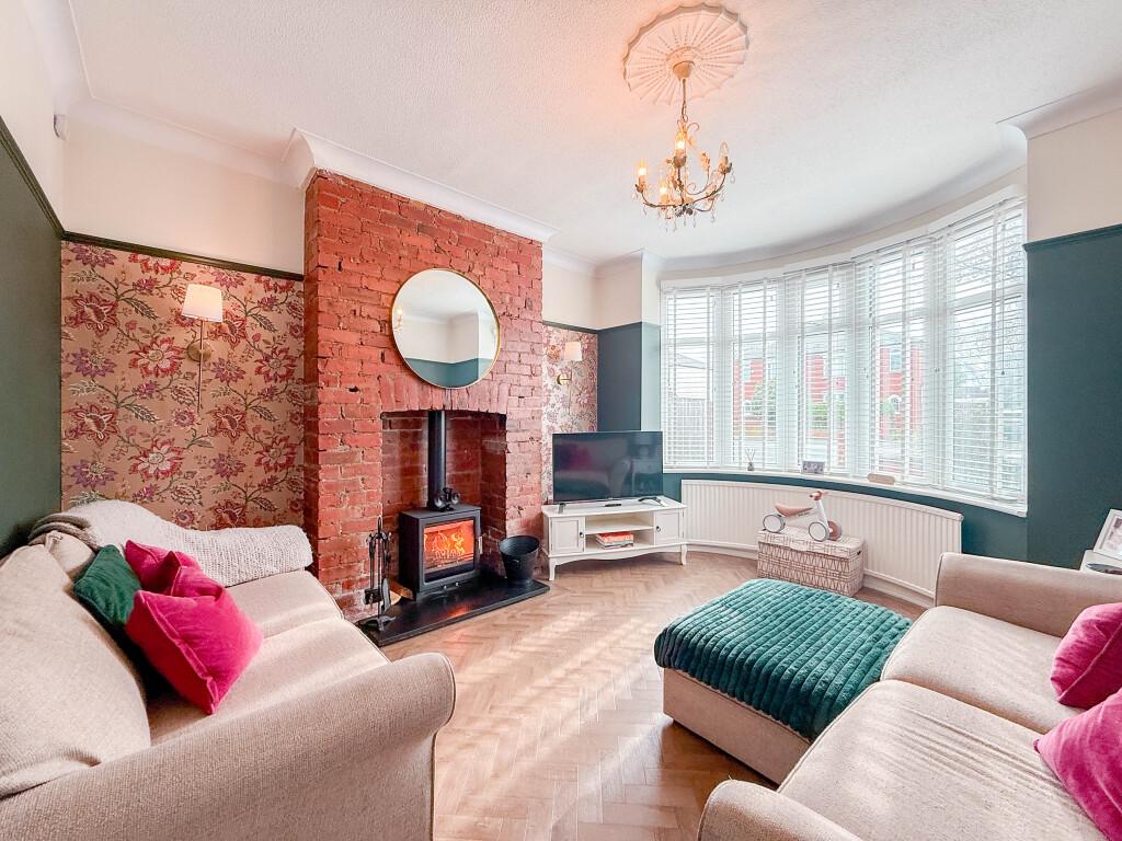 The accommodation begins with an entrance vestibule leading to a spacious hallway, separated by a timber framed, partially glazed door with characterful stained glass, a charming touch that sets the tone for the rest of the home. The bay fronted lounge features a striking brick feature wall and a multi-fuel burning stove, while the second lounge/diner spans the full depth of the property and includes French doors opening onto the rear garden. At the rear of the ground floor, the spacious kitchen is fitted with a range of timber base and wall units, a Belfast sink, Range style cooker and includes French doors to the garden. Upgraded LVT features within the hallway, lounge & second lounge/diner.