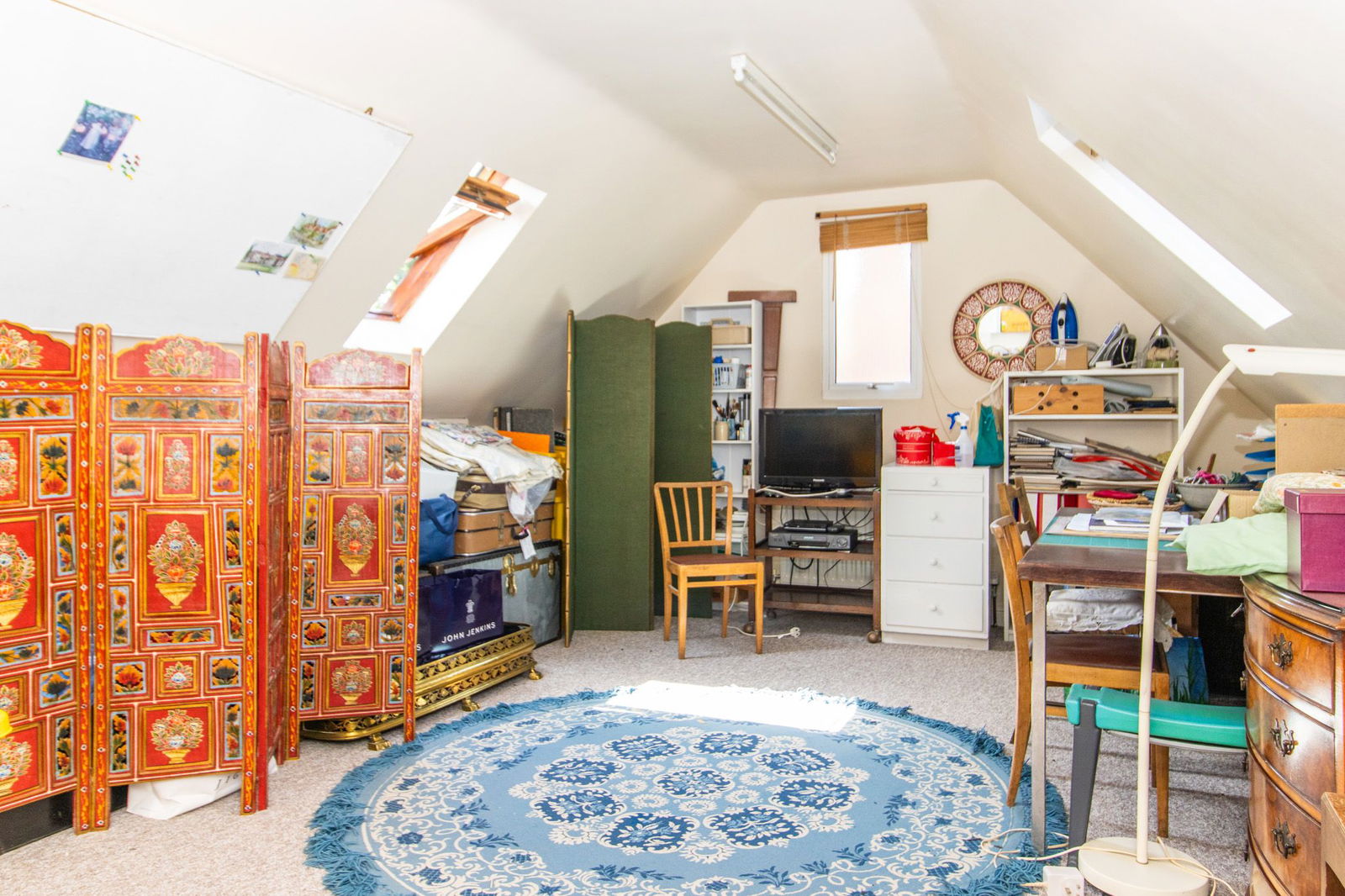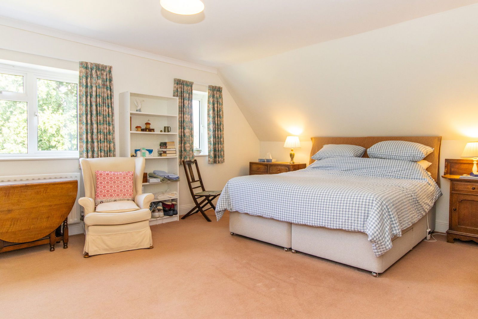On the landing, there is a linen cupboard and a further cupboard housing the boiler and hot water tank. A loft hatch with fitted ladder allows access to the large loft space. The principal bedroom has built-in wardrobes and a lovely view of the garden, as well as a dressing room with  built-in wardrobes and an ensuite bathroom with separate shower. There is a large studio/bedroom over the garage, 3 further double bedrooms and a family bathroom.