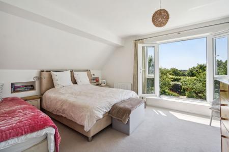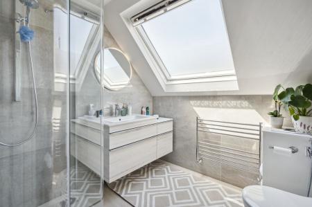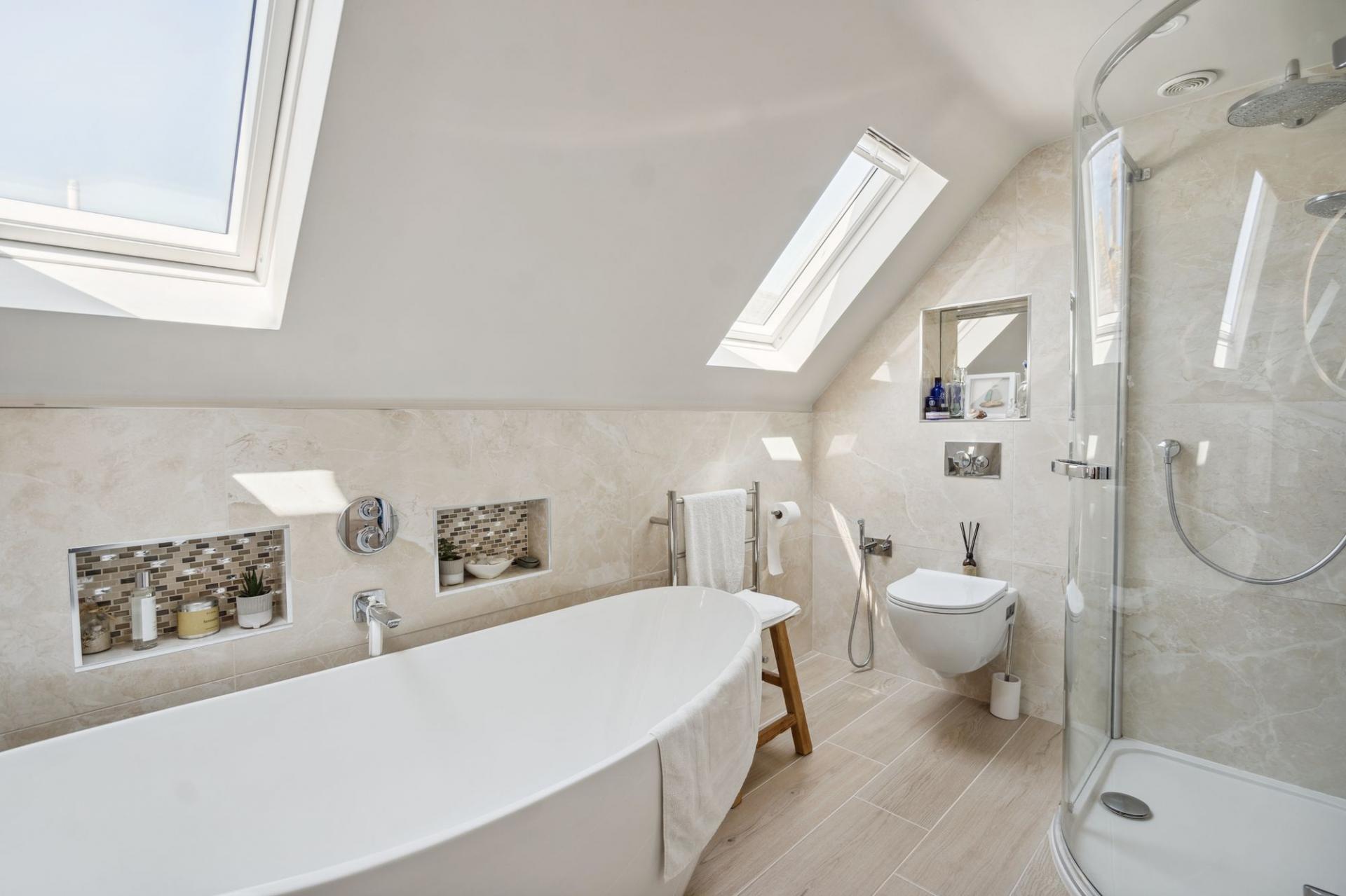 Stairs rise to a spacious landing giving access to the home's five bedrooms. The principal bedroom is a serene retreat with a practical dressing area and a Juliet balcony overlooking the garden. The en suite bathroom features a freestanding bath, floating vanity unit with storage, a separate shower cubicle, WC with attached douche, and a heated towel rail.