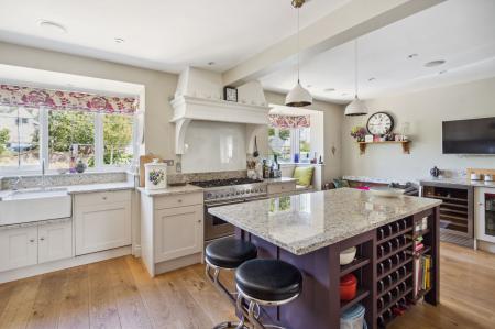 The sizeable kitchen and dining area is the heart of the home, centering around a large island. The kitchen boasts a wide range of base and wall units topped with luxurious granite worktops. Integrated appliances include a dishwasher, wine fridge, Rangemaster cooker, integrated microwave, and space for an American fridge freezer. A Butler sink adds a touch of traditional style. Underfloor heating ensures comfort and warmth.