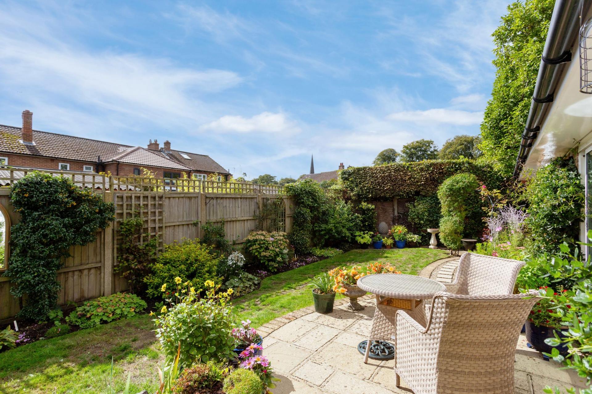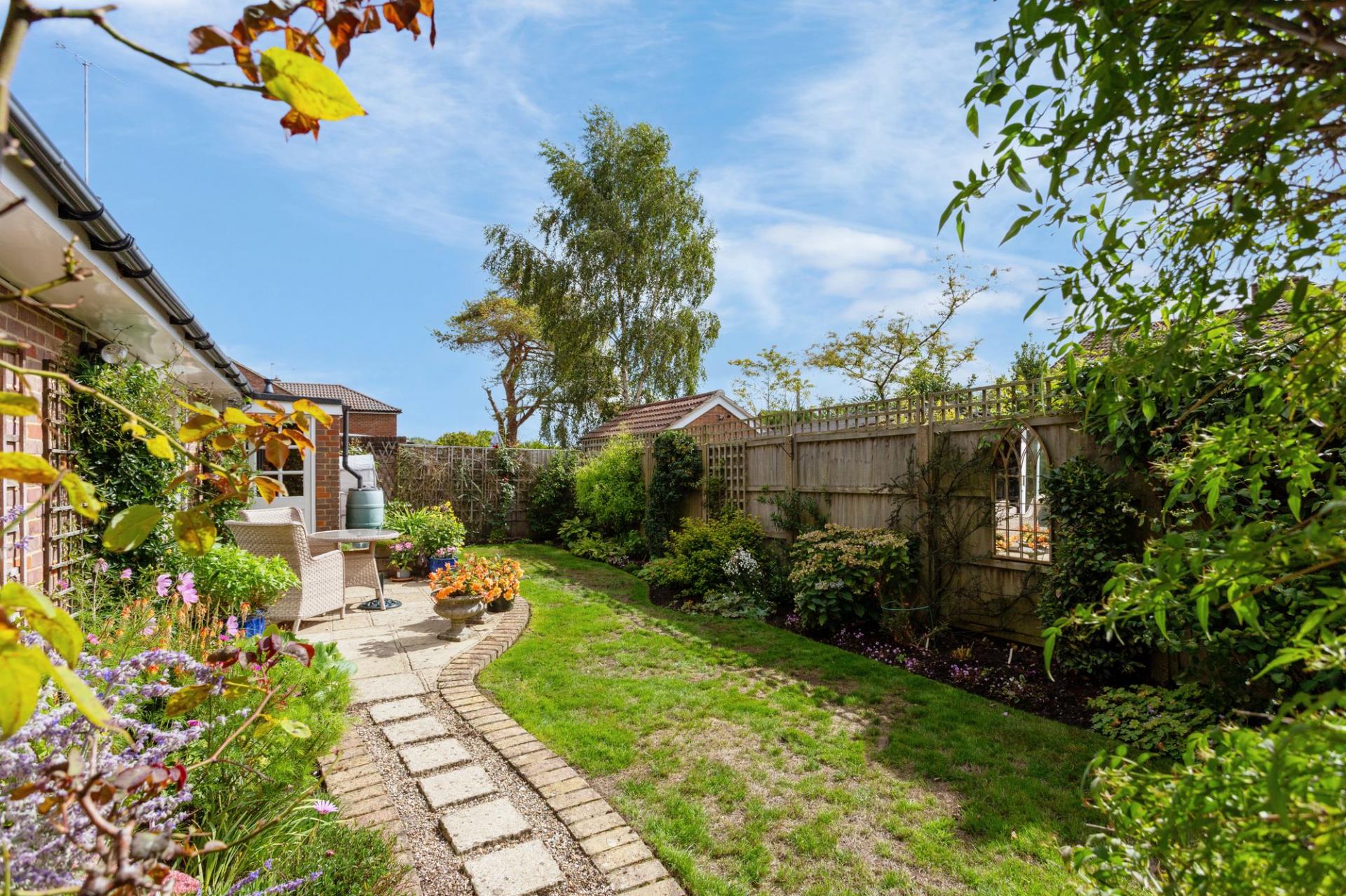 - South-facing rear garden with terrace, lawn, mature planting, and secure pond