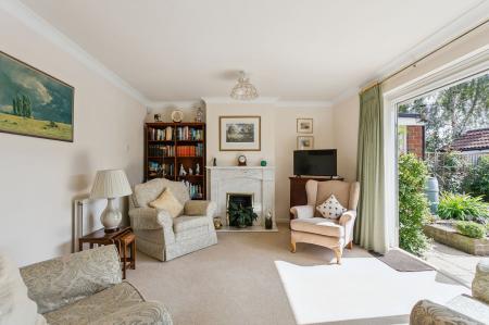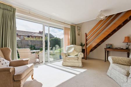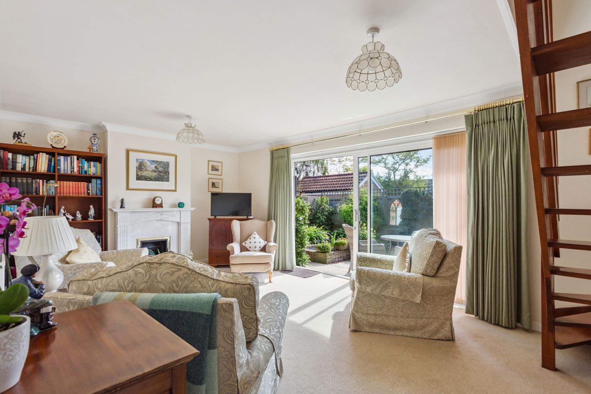 - Spacious main reception room with gas fire, open-tread staircase, and sliding doors to the garden