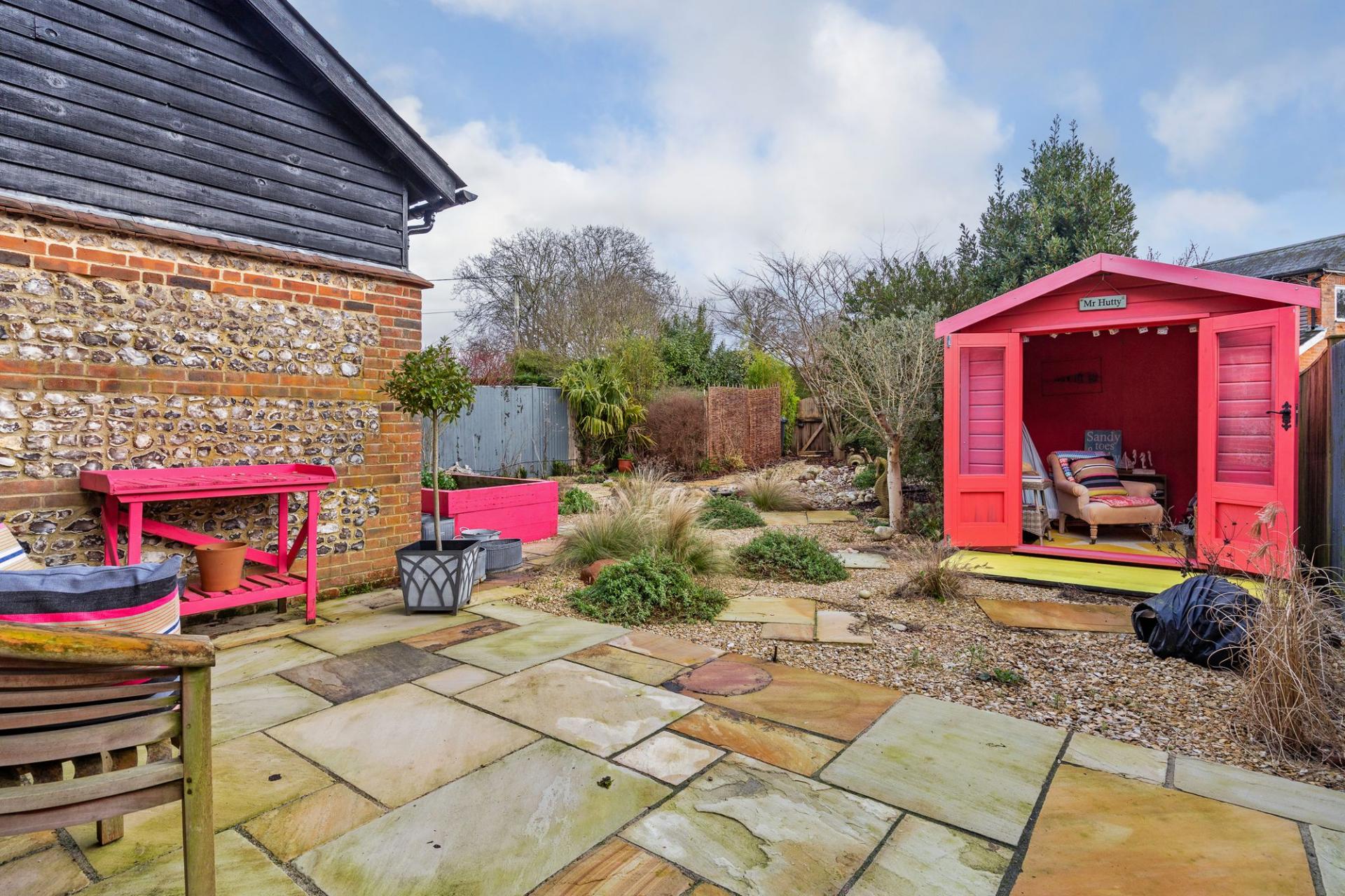 Outside, the property has a secure feel to it and is approached over a communal courtyard, to the front of the property is parking for three cars and a garage. The rear garden has been re-landscaped and creates a beach vibe with an Indian sandstone patio directly behind the house that graduates onto a gravel area with pebbles that create a riverbed theme leading to a pond. There are interspersed shrubs and the garden is enclosed by close boarded fencing with a beach hut summerhouse.