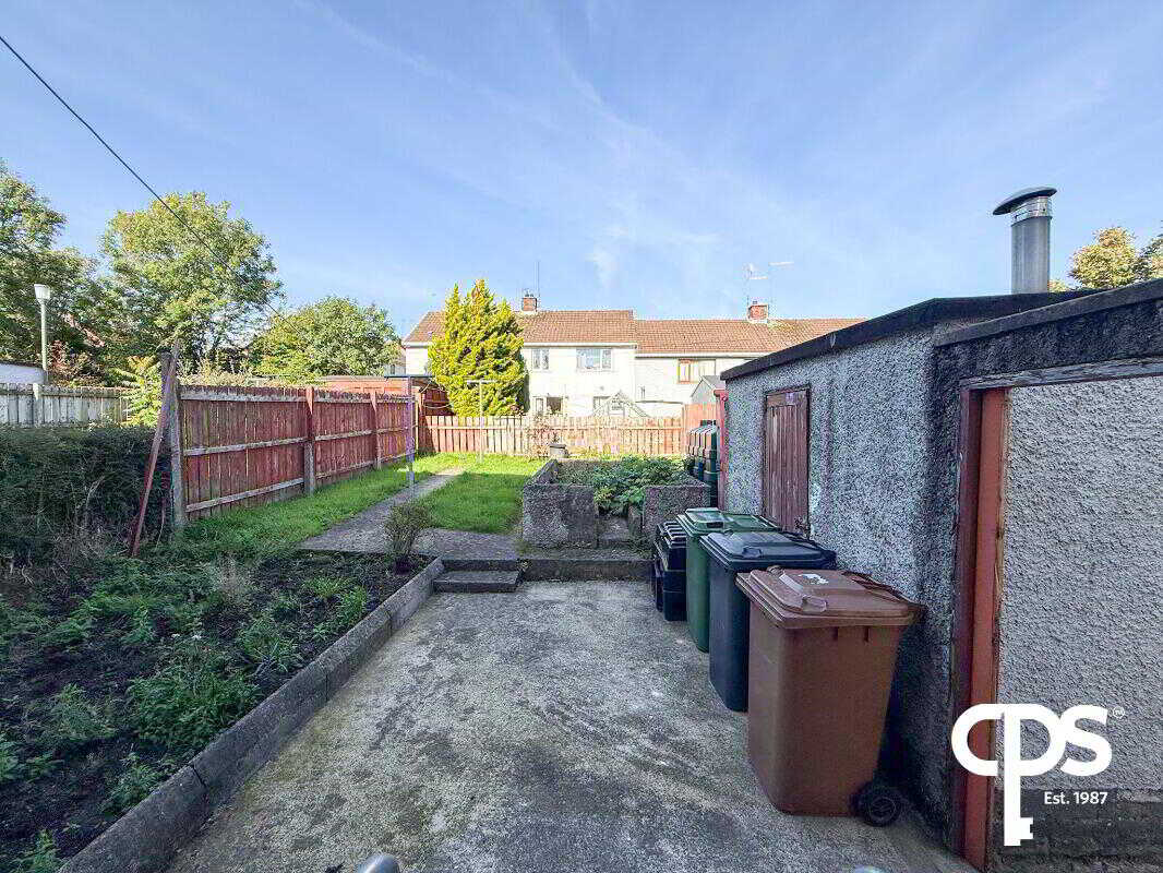 Rear Garden: Enclosed garden with a mix of lawn and concrete patio, plus an outside shed for storage.