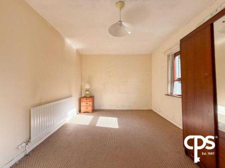 Spacious rear facing bedroom with carpet flooring and double radiator.