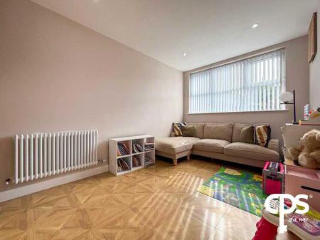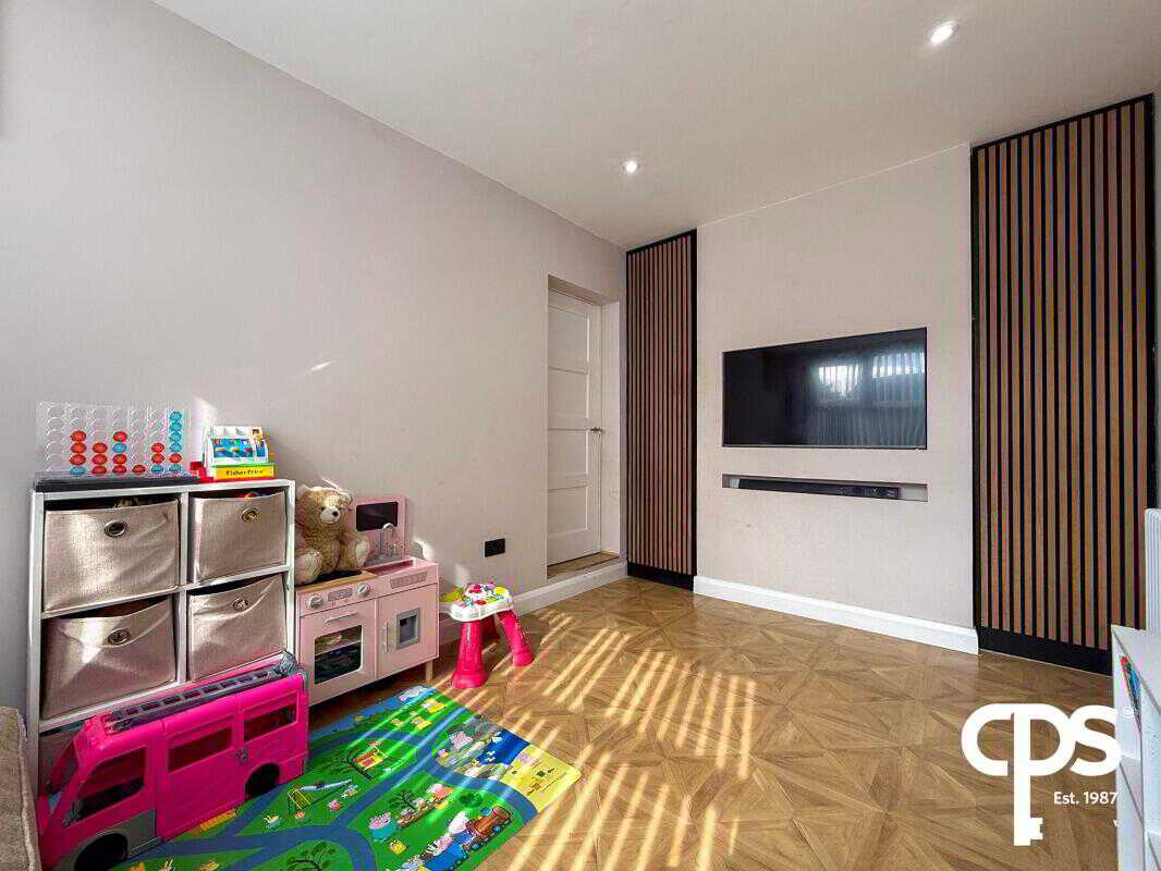 Located to the rear, this spacious room features laminated wooden flooring, a suspended TV bracket with sockets, and a radiator—ideal as a second lounge or entertainment space.