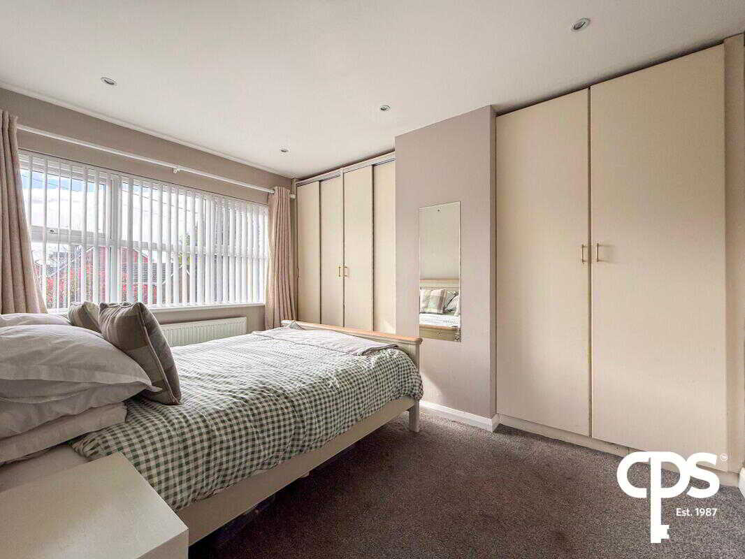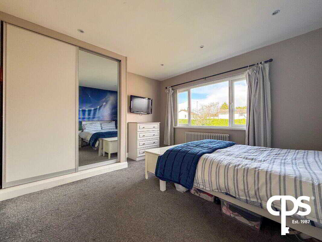 A spacious double bedroom featuring carpeted flooring, a stylish panelled feature wall, and integrated sliding wardrobes. Includes radiator and TV wall mounting point.