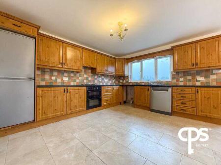 A spacious kitchen and dining area finished with tiled flooring and fitted with a range of high- and low-level wooden units. The kitchen includes an integrated cooker, space for a fridge, and provision for a washing machine and dishwasher. A newly installed double radiator and direct access to the rear garden via an external door complete this versatile family space.