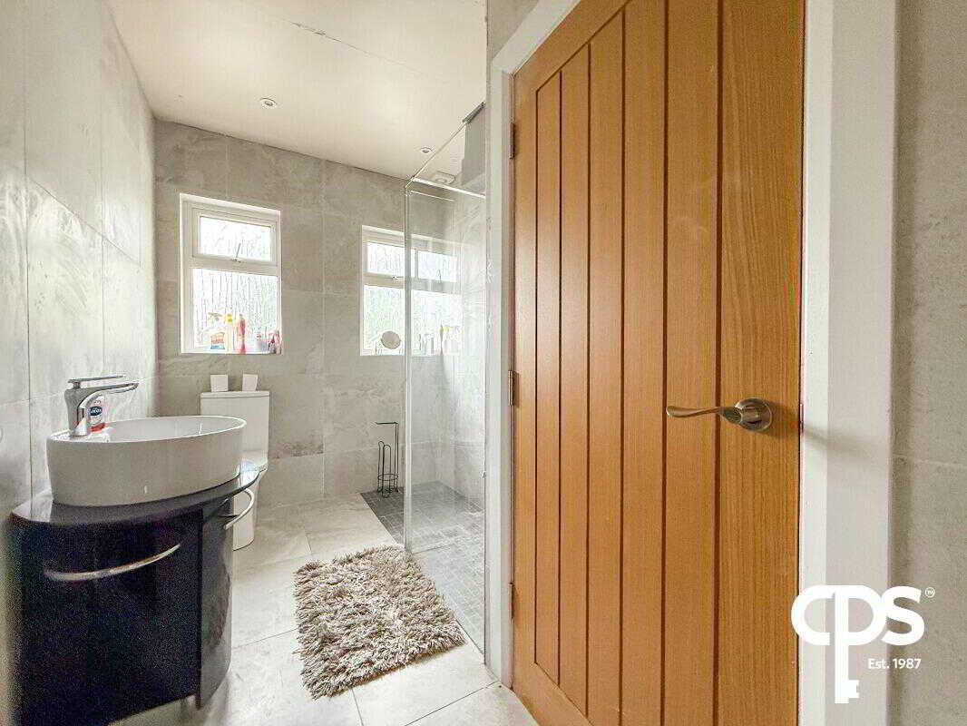 Contemporary, fully tiled bathroom comprising new sink, WC, and walk-in electric shower.