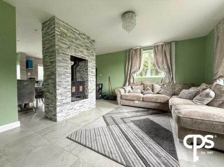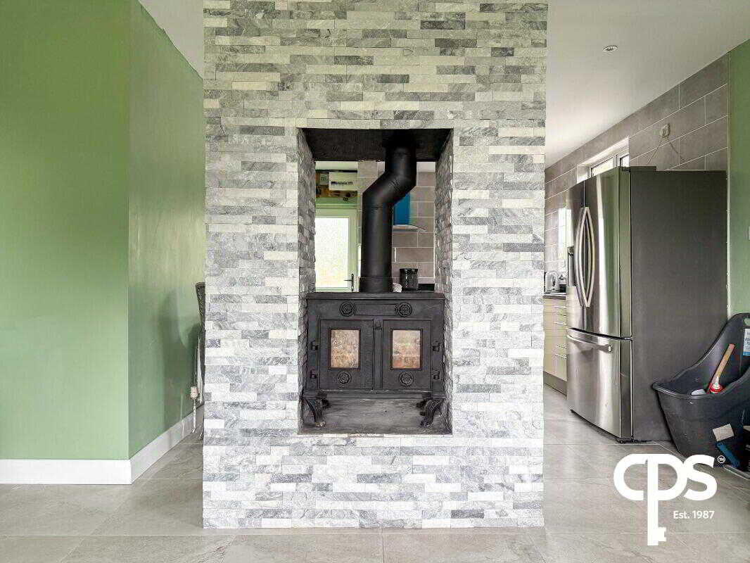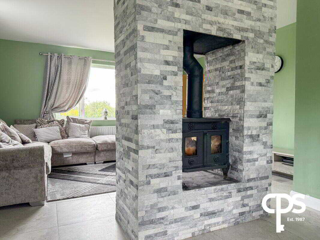 Bright and spacious front-facing reception with tiled flooring. Open-plan layout featuring a double-sided stove with natural stone cladding surround, creating a warm focal point.