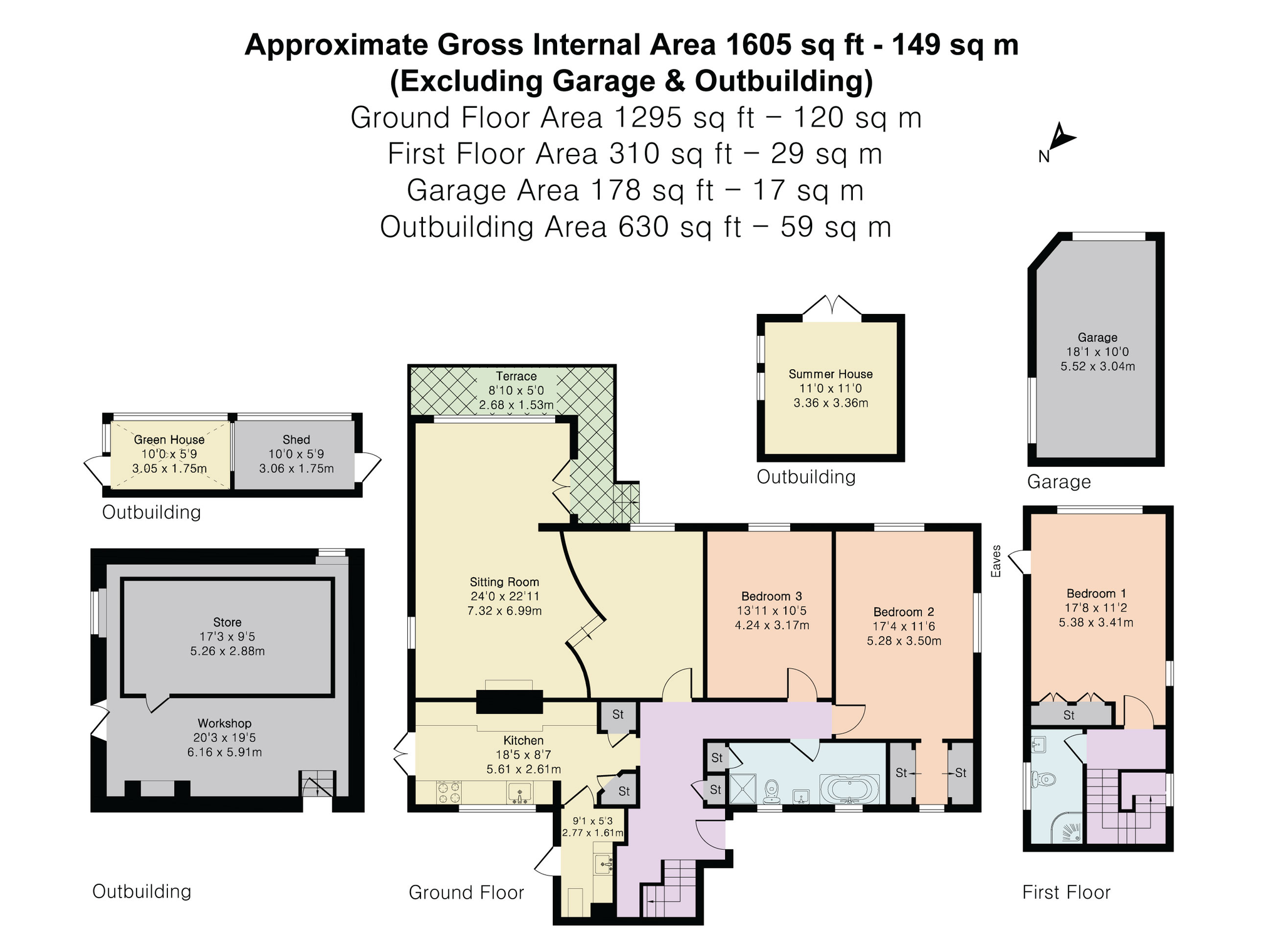 Outside the house is approached via a tarmacked driveway with ample parking and a garage there are further outbuildings including a workshop and store and a summerhouse. The gardens are mainly laid to lawn with shrubs and trees and a vegetable garden.