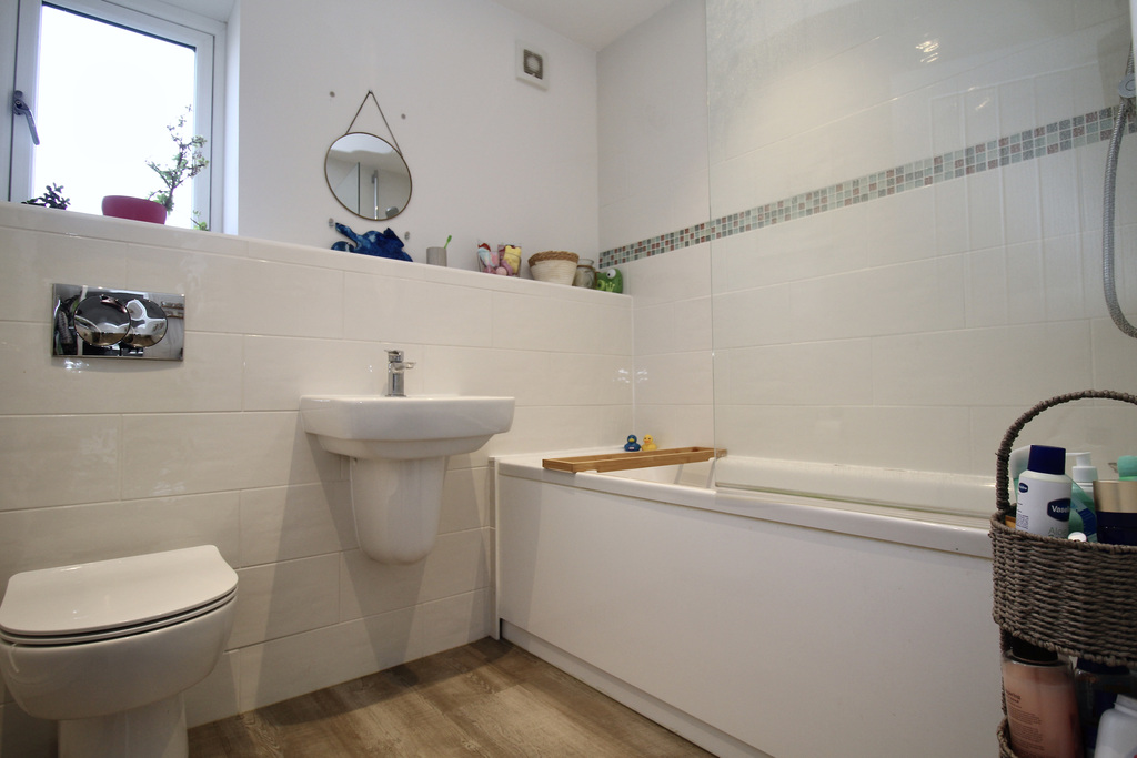 - A contemporary family bathroom fitted with a white suite, panelled bath with shower over, wash basin, WC and heated towel rail.