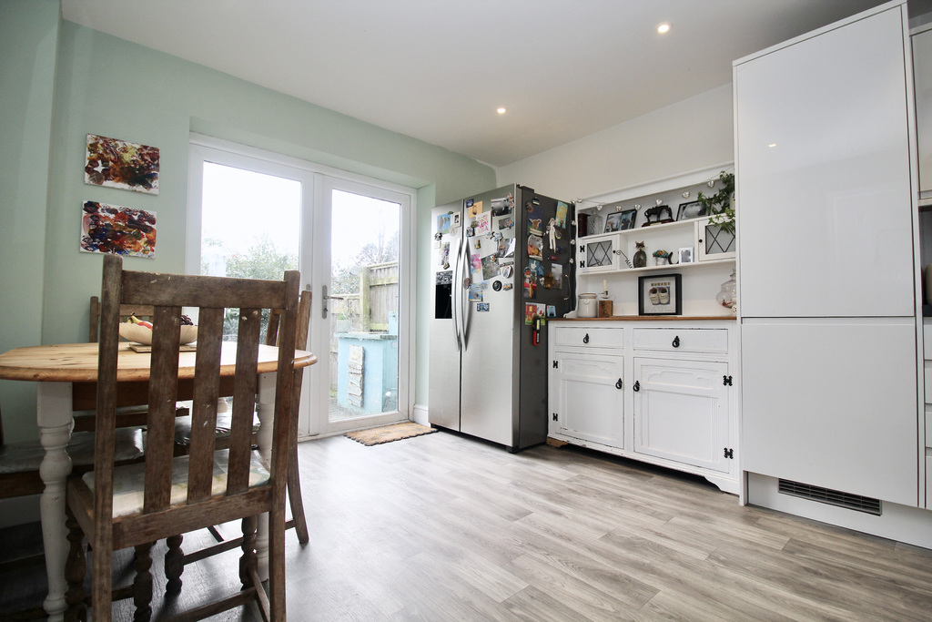- The dining area provides ample space for a family-sized table and chairs, perfect for everyday meals and entertaining, with French doors opening directly onto the rear garden.