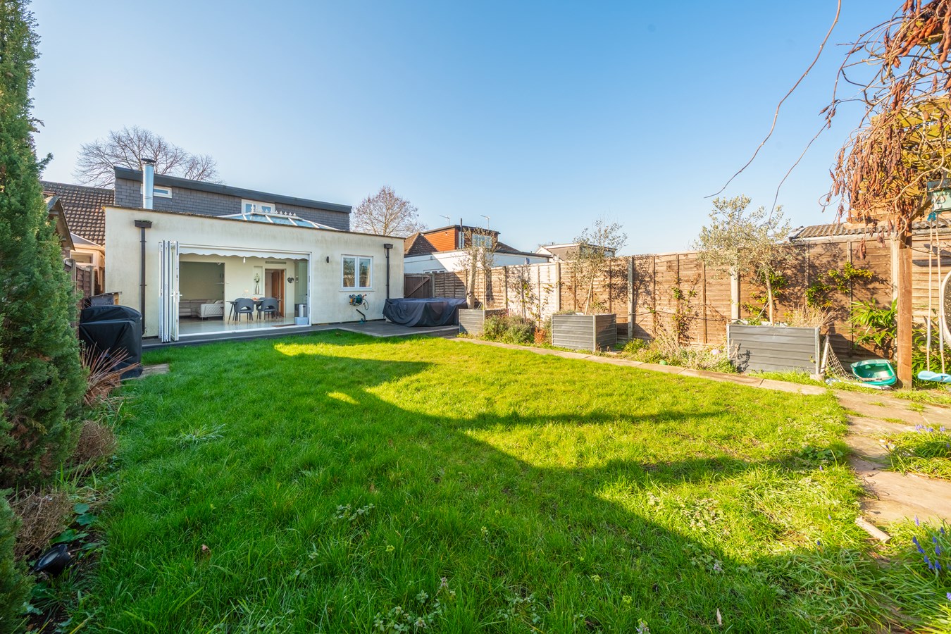 A truly exceptional and deceptively spacious four bedroom semi-detached bungalow that has been thoughtfully extended and beautifully remodelled to create a stunning family home presented in immaculate, turn-key condition throughout. The heart of the home is the impressive rear extension which has transformed the property into a fantastic open-plan kitchen / dining / living space with a wood burner. Designed very much with modern living and entertaining in mind, this superb room features a stylish fitted kitchen with integrated appliances and ample worktop space, seamlessly flowing into the dining and living areas. Large bifold doors open directly onto the rear garden, allowing natural light to flood the room and creating the perfect indoor-outdoor space for entertaining friends and family. The ground floor accommodation also provides two excellent double bedrooms and a third single bedroom, ideal as a nursery, home office or guest room. These rooms are serviced by a truly impressive luxury bathroom suite featuring a large bath and stylish “his and hers” sinks, creating a real boutique hotel feel. Upstairs, the property has been cleverly converted to create a spectacular principal bedroom suite. This stunning space incorporates a generous bedroom area, walk-in wardrobe and a beautifully designed open-plan freestanding bath, complemented by a separate modern shower room, creating a private and luxurious retreat. Externally the property continues to impress with a rear garden accessed directly from the bifold doors, ideal for relaxing or entertaining during the warmer months The property also benefits from a garage and useful outbuilding with power, offering additional storage or potential workspace. Homes of this calibre rarely come to market. With its flexible layout, high quality finish and stunning open-plan living space, this is a property that must be viewed to be fully appreciated.