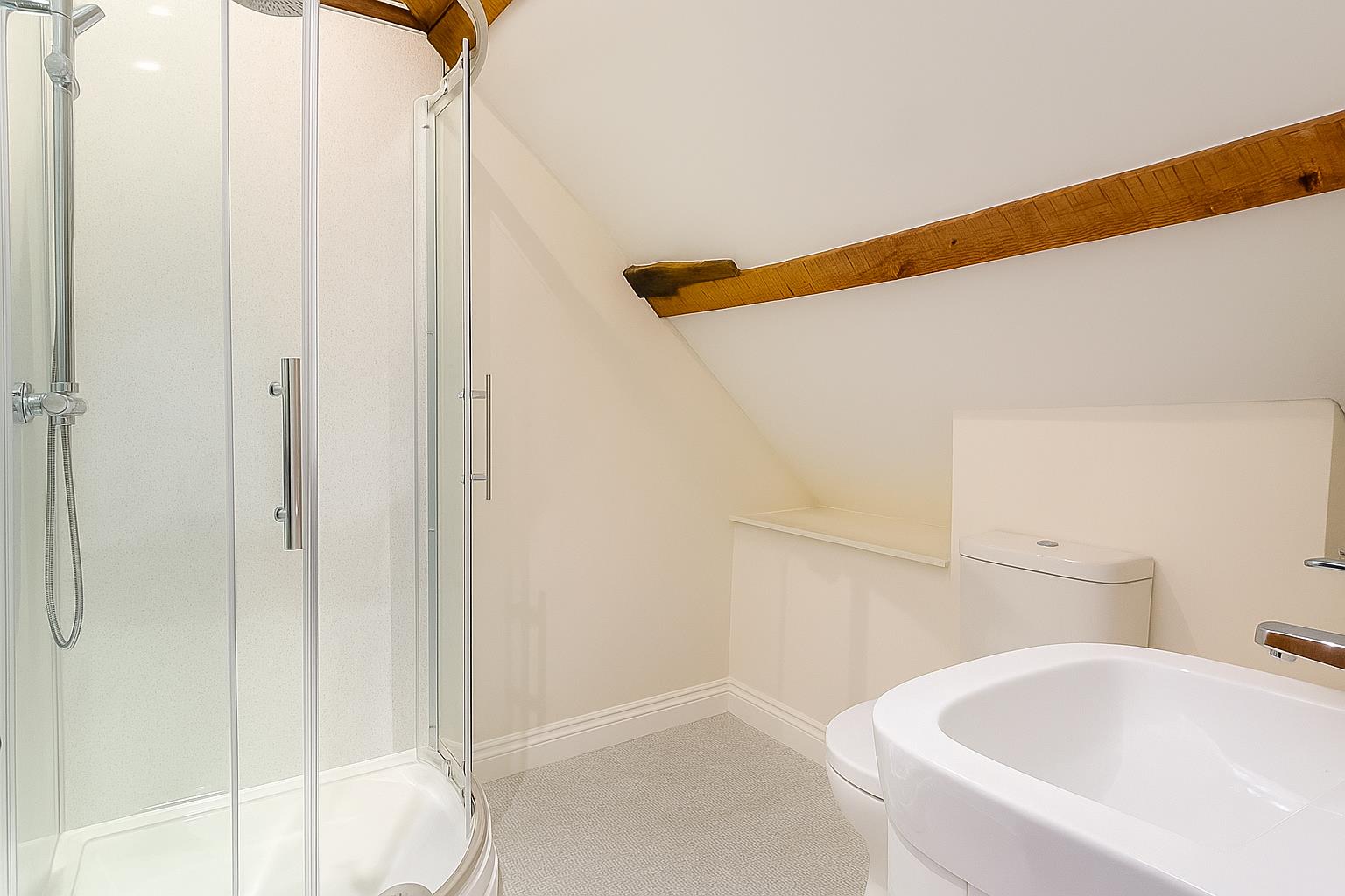 En-Suite - 2.04 x 2.07 (6'8" x 6'9") - Fitted with a white suite this en-suite comprises a low level hand flush w.c. a pedestal hand wash basin and a shower cubicle with a wall mounted waterfall effect mains shower.
