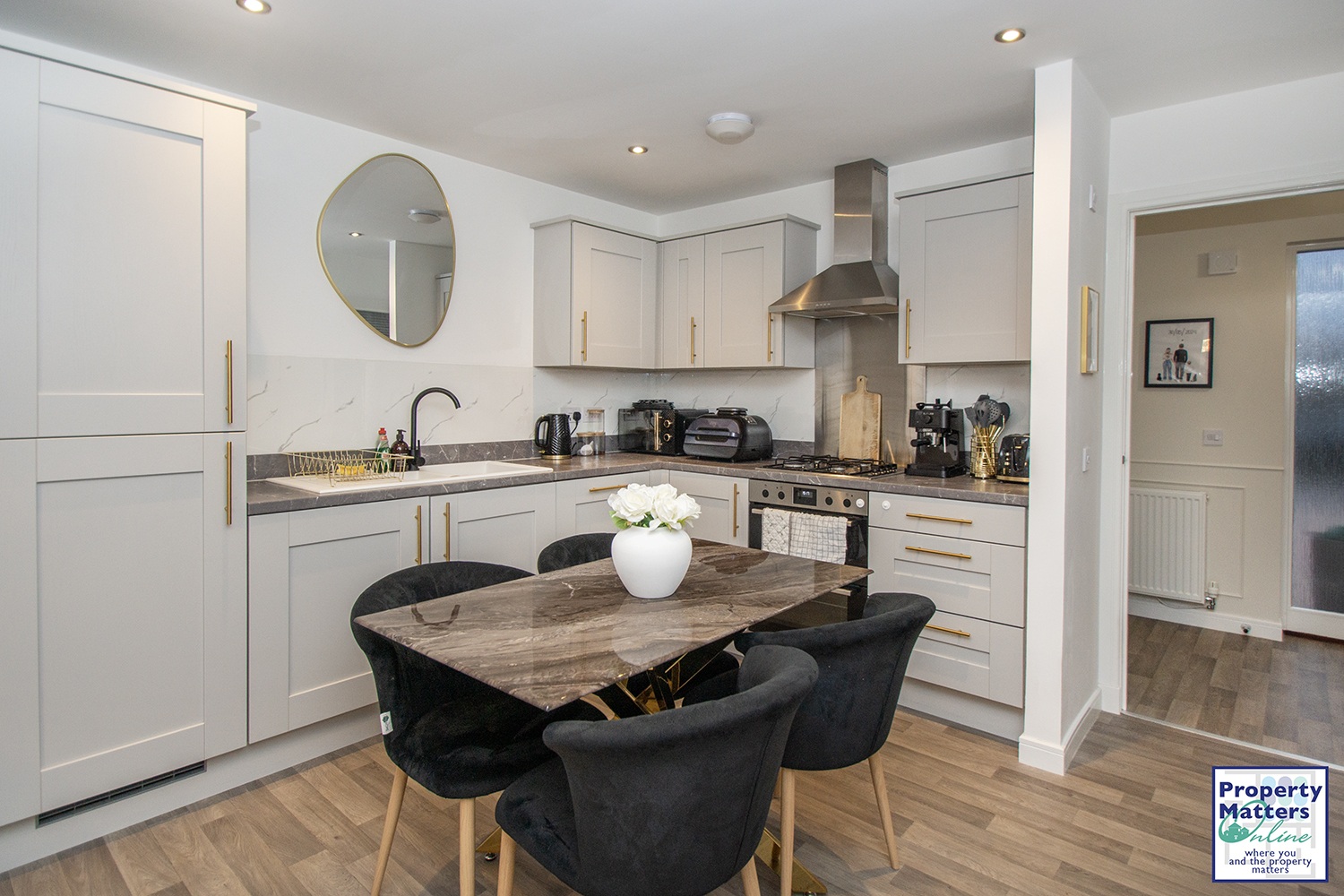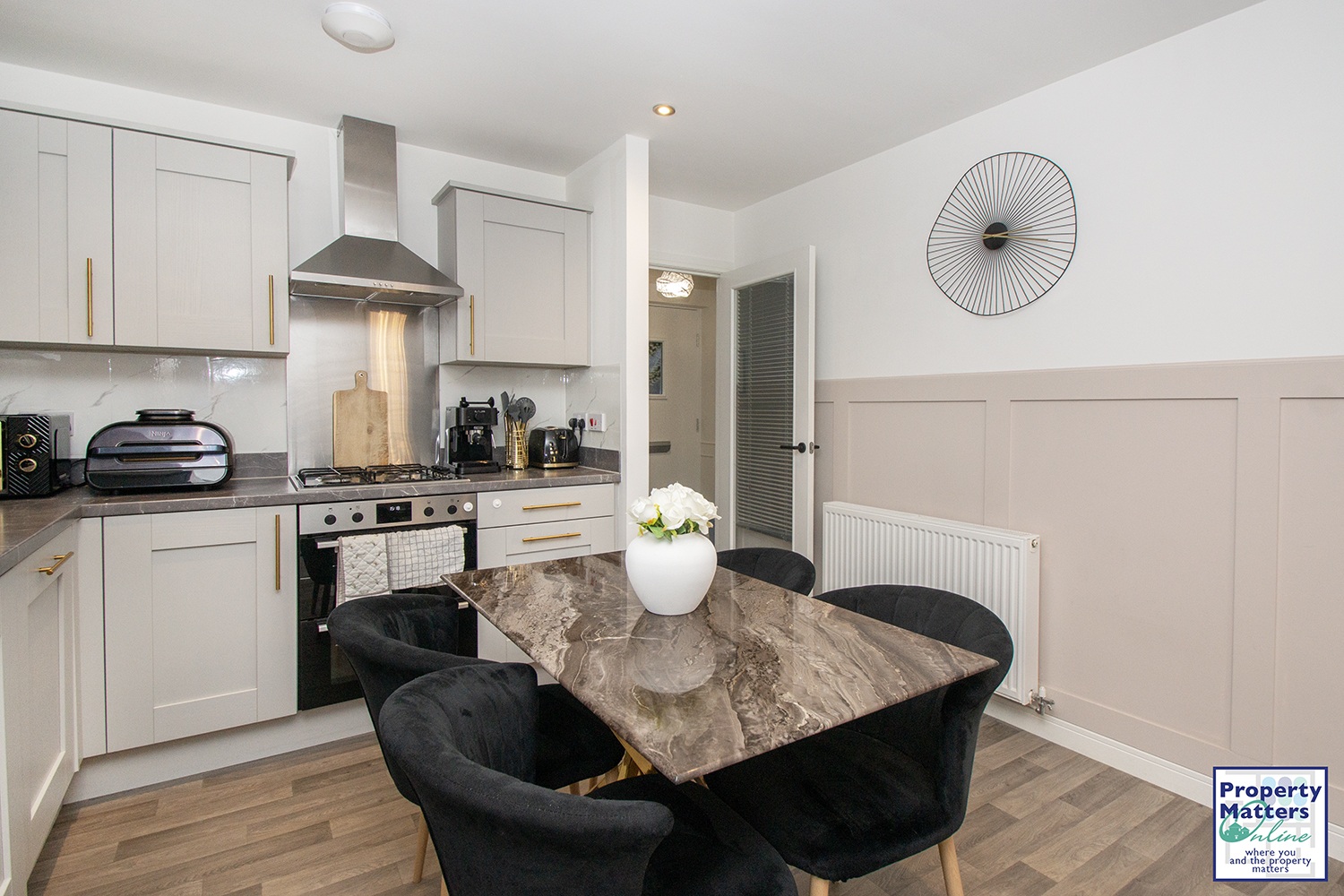 The open-plan kitchen and living area is perfect for modern family living. The kitchen is contemporary and well-equipped, offering a range of upper and lower cabinets and integrated appliances including a fridge freezer, oven, gas hob, extractor fan, washing machine, and dishwasher. There is also ample space for a dining table. The living area is bright and inviting, featuring patio doors and a window that fill the space with natural light, and a handy storage cupboard under the stairs.