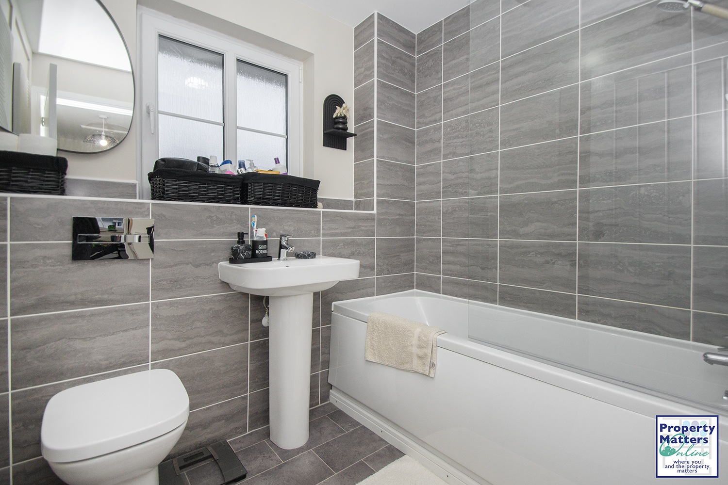 Upstairs, the landing leads to three generous bedrooms, accompanied by a modern family bathroom. The bathroom includes a wash hand basin, WC, bath with overhead shower, and a stylish combination of half-tiled walls and fully tiled bath surround. Additional storage is provided with an upstairs cupboard in the hall.