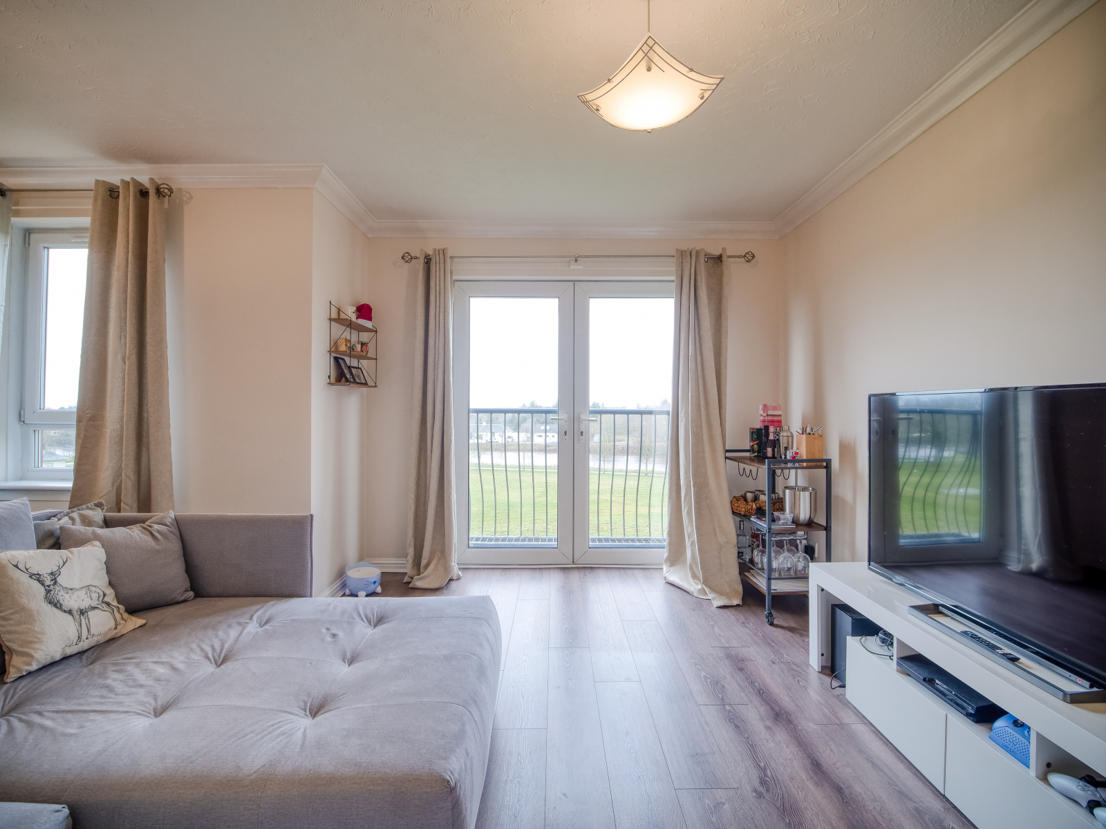 A standout feature is the generous lounge, complete with French doors that open to views across the Low Green and the River Irvine. The property also includes a fitted kitchen, two bedrooms with built in wardrobes and a contemporary shower room with a walk in enclosure.