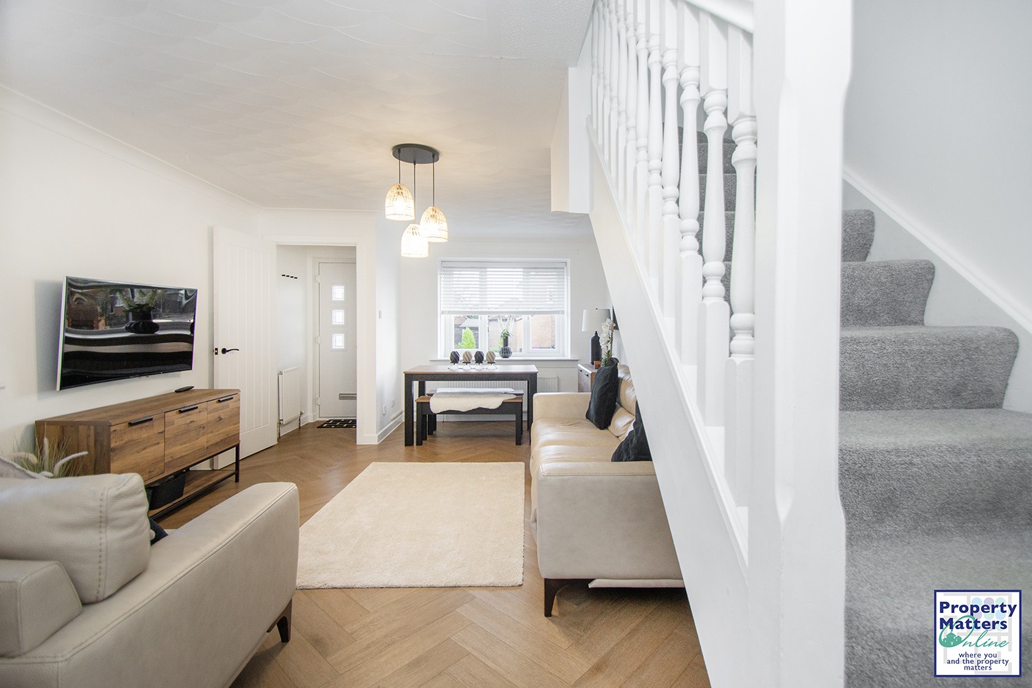 On entering the property, you are welcomed into an entrance vestibule leading through to a spacious lounge with dining area. This attractive living space benefits from large windows to both the front and side, allowing an abundance of natural light to flood the room. To the rear, the modern fitted kitchen features a range of upper and lower wall-mounted cabinets and integrated appliances, including a gas hob, extractor fan, oven, microwave, and fridge freezer. The kitchen also provides direct access to the rear garden, making it ideal for everyday living and entertaining.