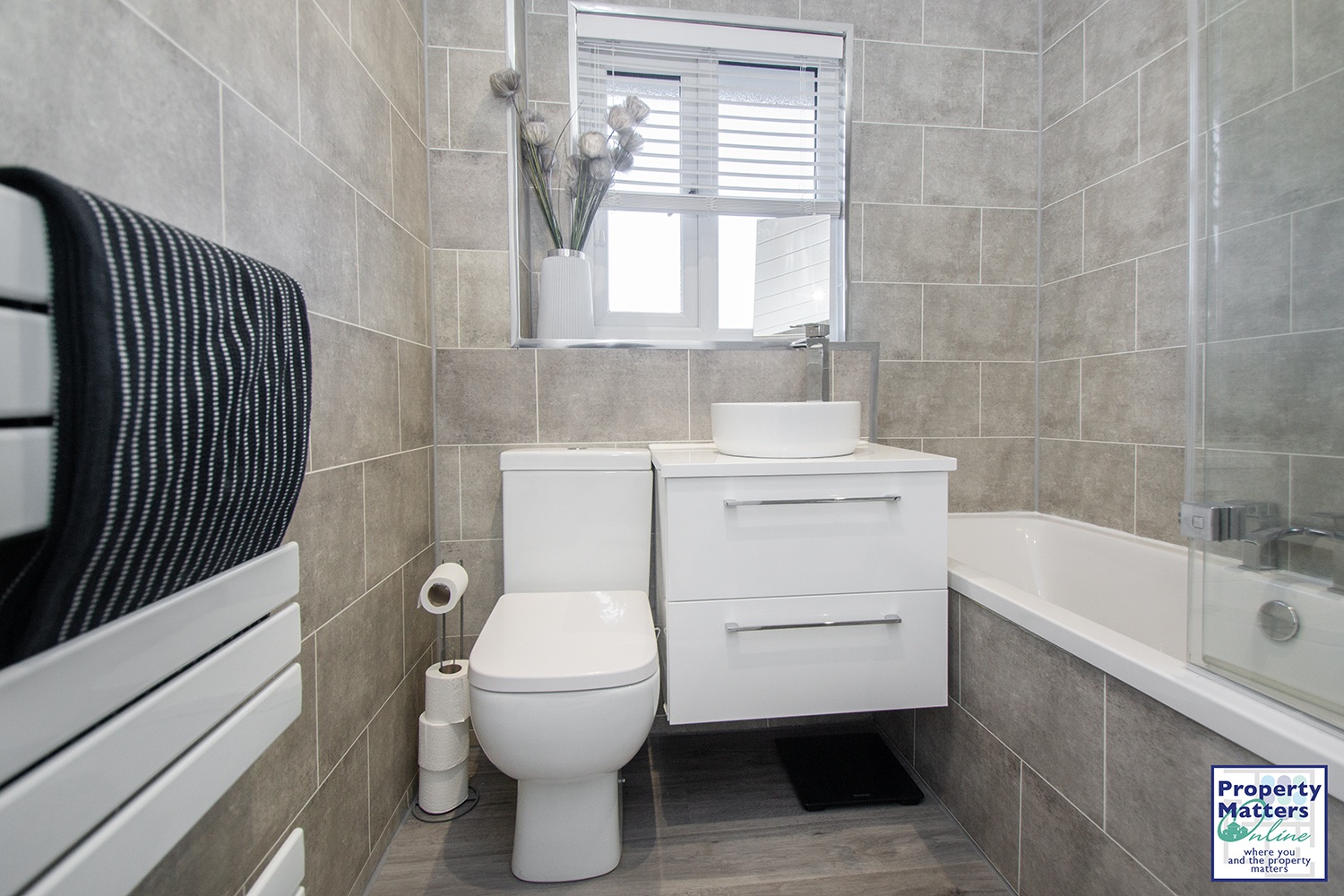 The upper level comprises two generously sized bedrooms, both of which benefit from built-in wardrobes. The contemporary family bathroom is finished with tiled walls and includes a wash hand basin with storage drawers, WC, bath with over-shower, and a heated towel radiator.