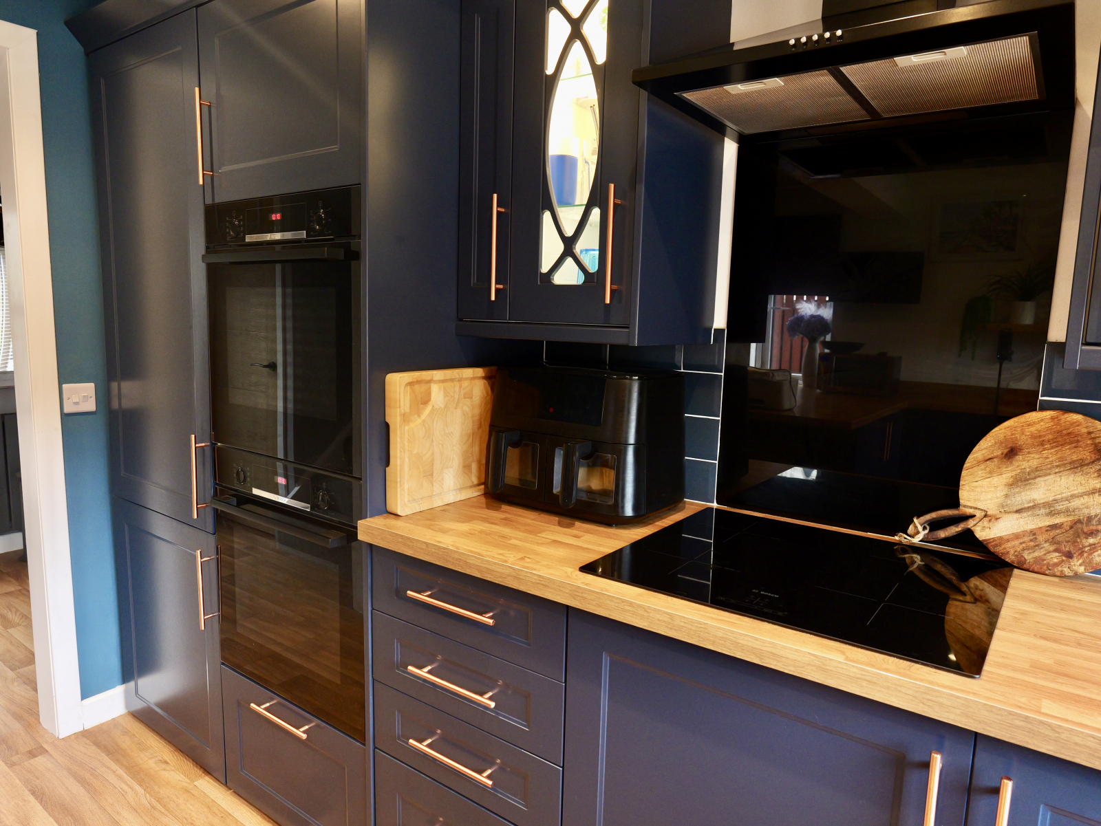 - Modern fitted kitchen with ample base and wall units, complementary worktops, and integrated appliances