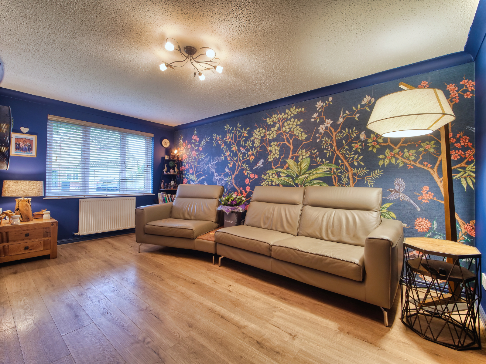 Upon entering the welcoming hallway which leads to a bright and spacious living room featuring a stylish panelled wall, contemporary décor, and a useful storage cupboard.