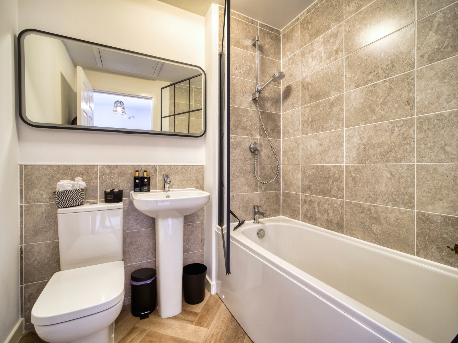 Upstairs, the hallway leads to two well-proportioned double bedrooms. One-bedroom benefits from built-in wardrobes, while the other is currently staged as a spare bedroom and home office, featuring a double work-from-home desk area. The modern family bathroom is partially tiled and comprises a wash hand basin, WC, and a bath with an overhead shower.