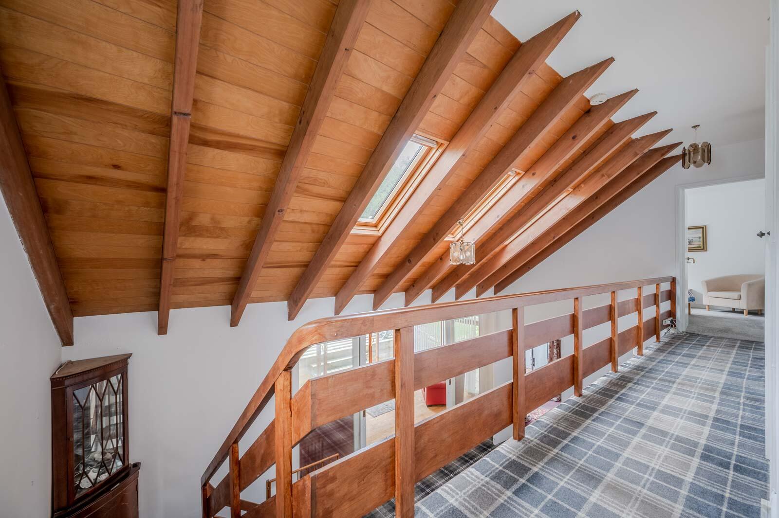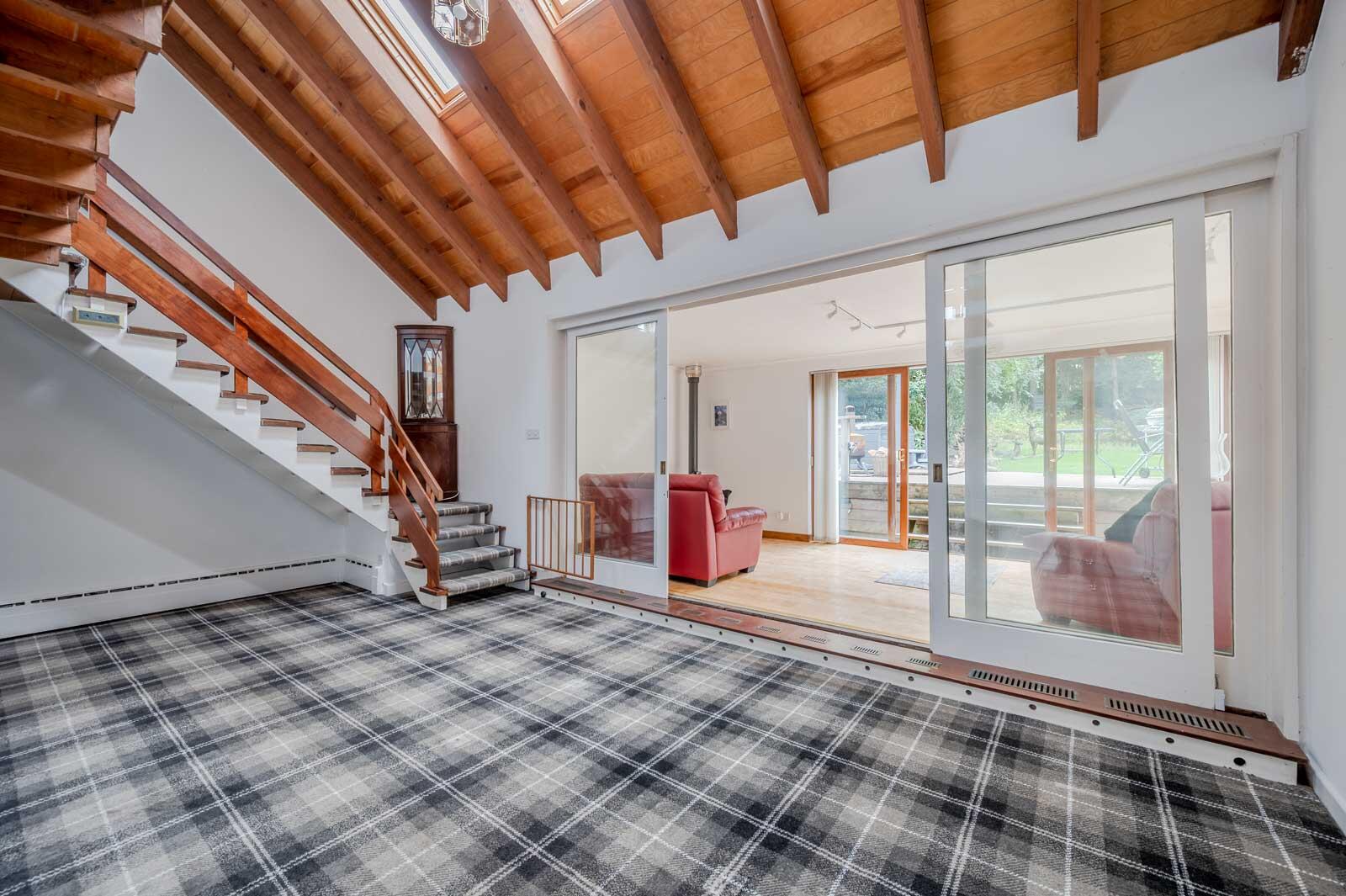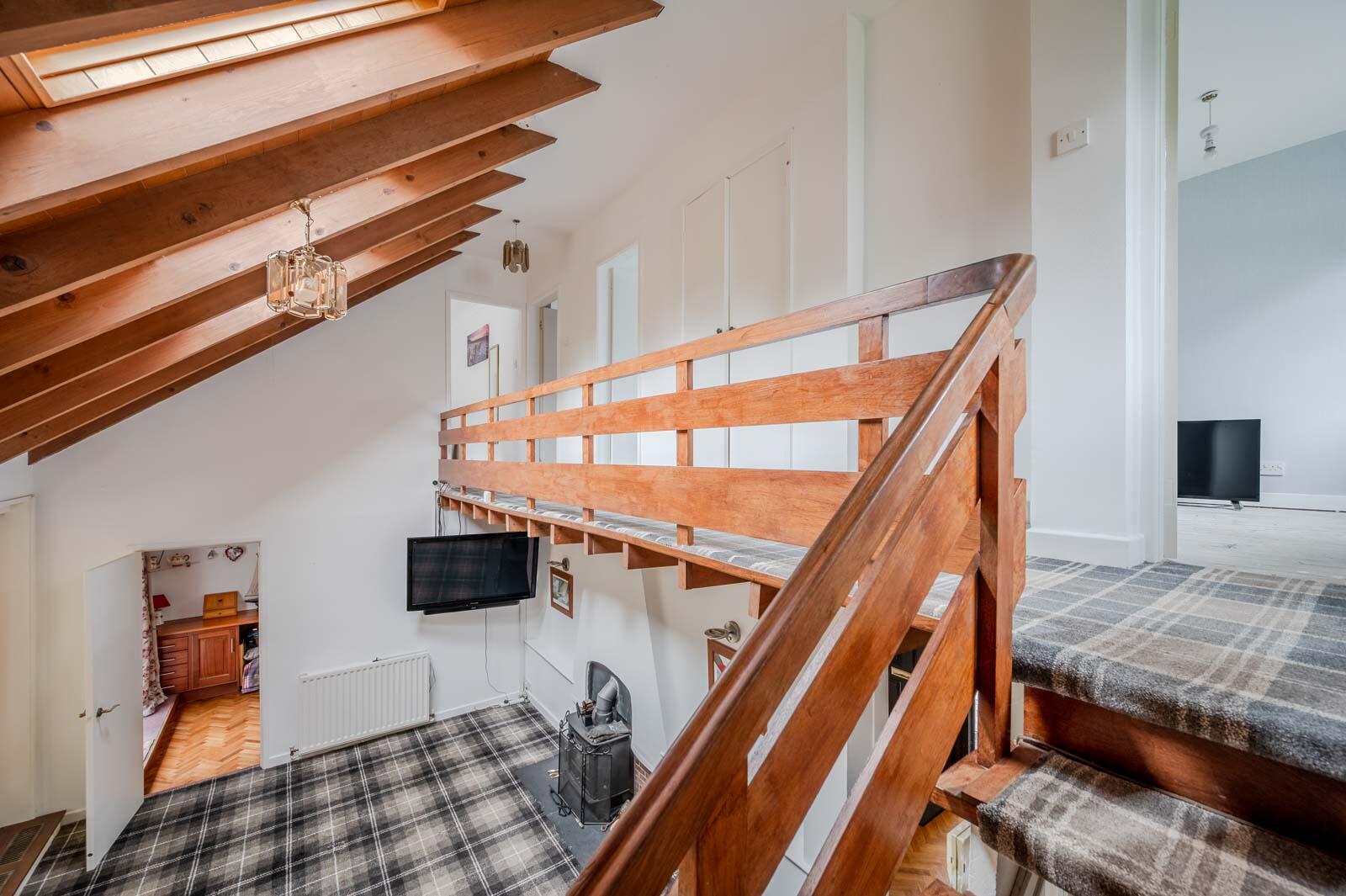 Drawing Room - 6.22 x 5.02 (20'4" x 16'5") - With vaulted tongue and groove ceiling, Velux windows x three, cast iron wood burning stove on slate hearth, sliding glazed double doors to garden room, open tread staircase from drawing room to first floor minstrel gallery landing.