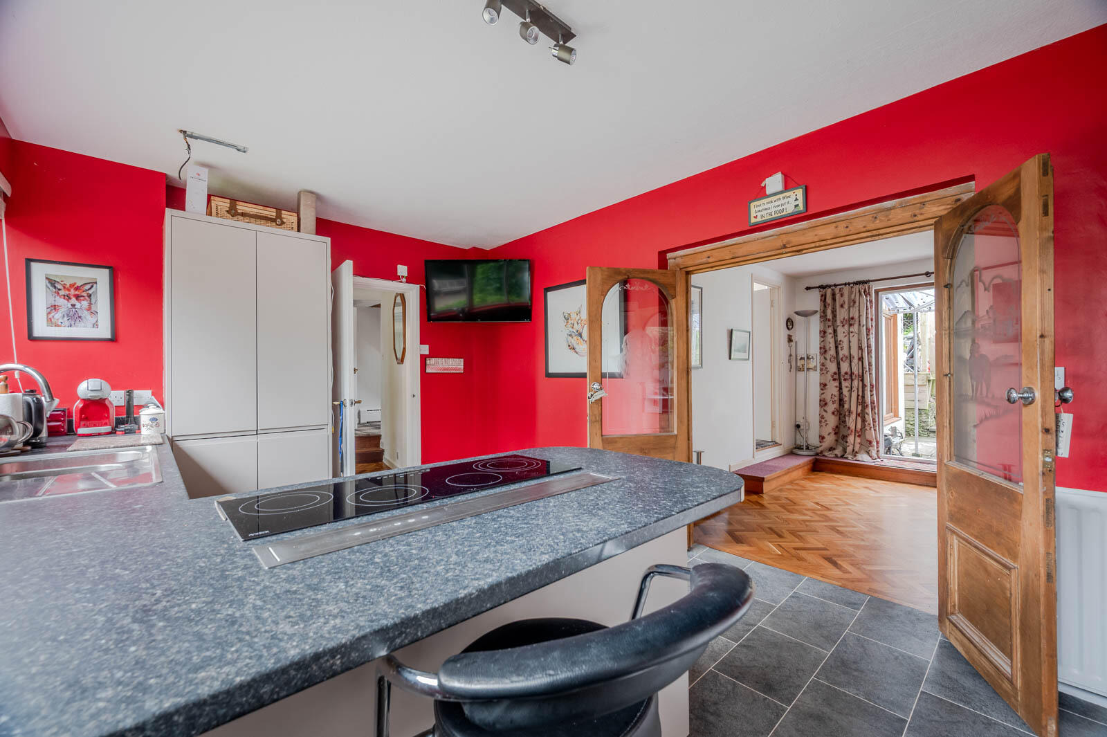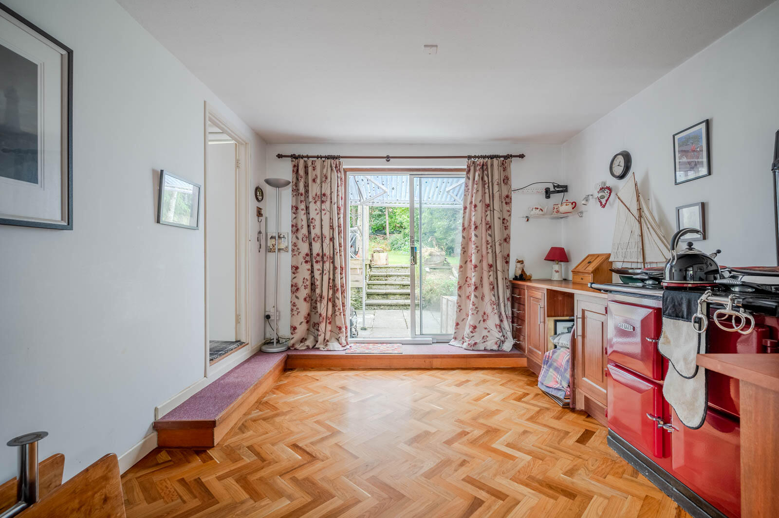 Dining Room - 3.71mx 3.48m (12'2x 11'5) - Original parquet wood block flooring, Redfyre range cooker, access to Redfyre boiler for heating and hot water, double glazed sliding patio doors to rear patio and garden, access door to drawing room and kitchen.