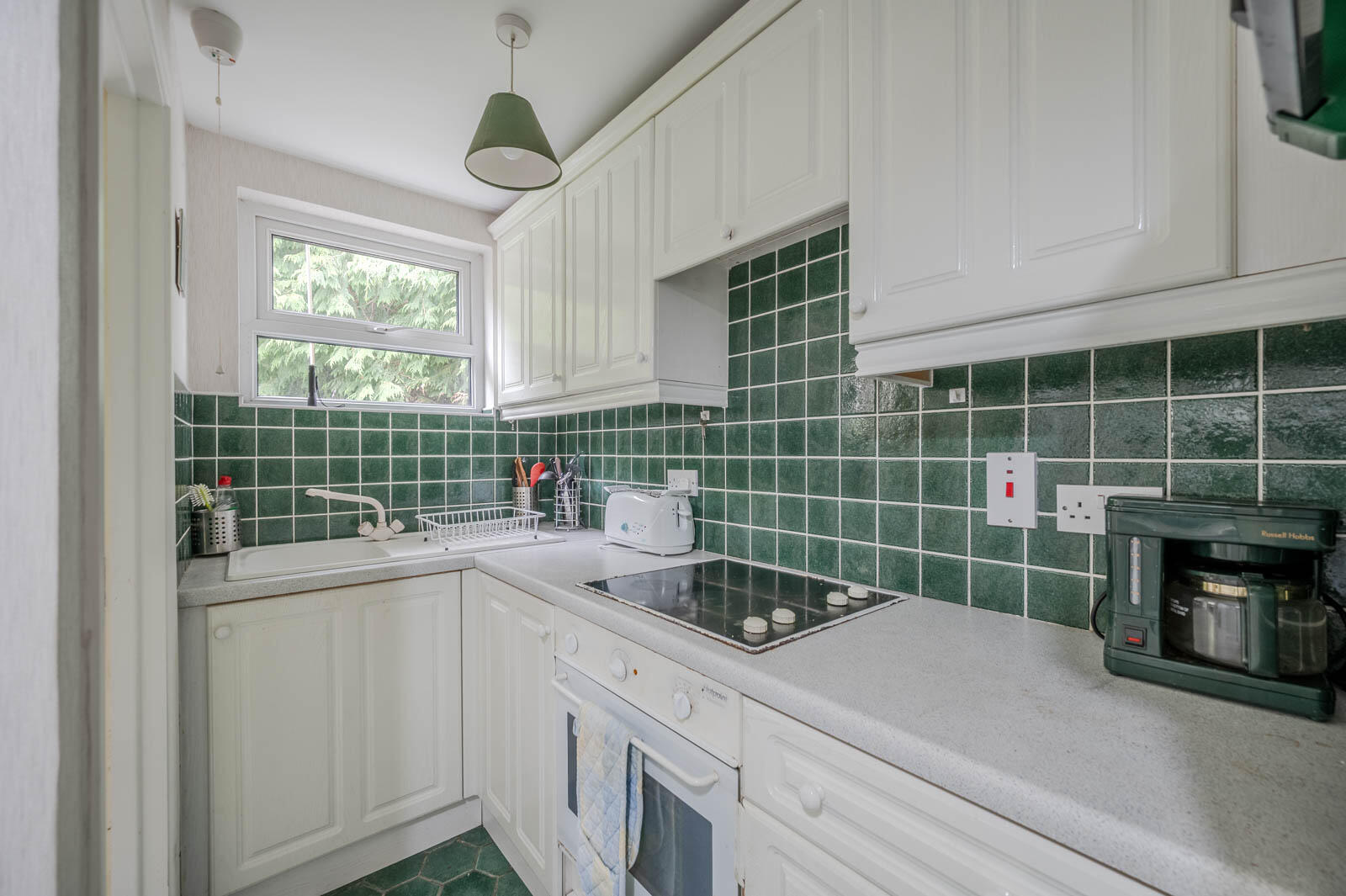 Kitchen - 4.18 x 3.2 (13'8" x 10'5") - Range of high and low level units, laminate work surface, part tiled walls, integrated four ring ceramic hob, oven below, extractor fan, ceramic single drainer sink unit with mixer tap, outlook to rear garden.