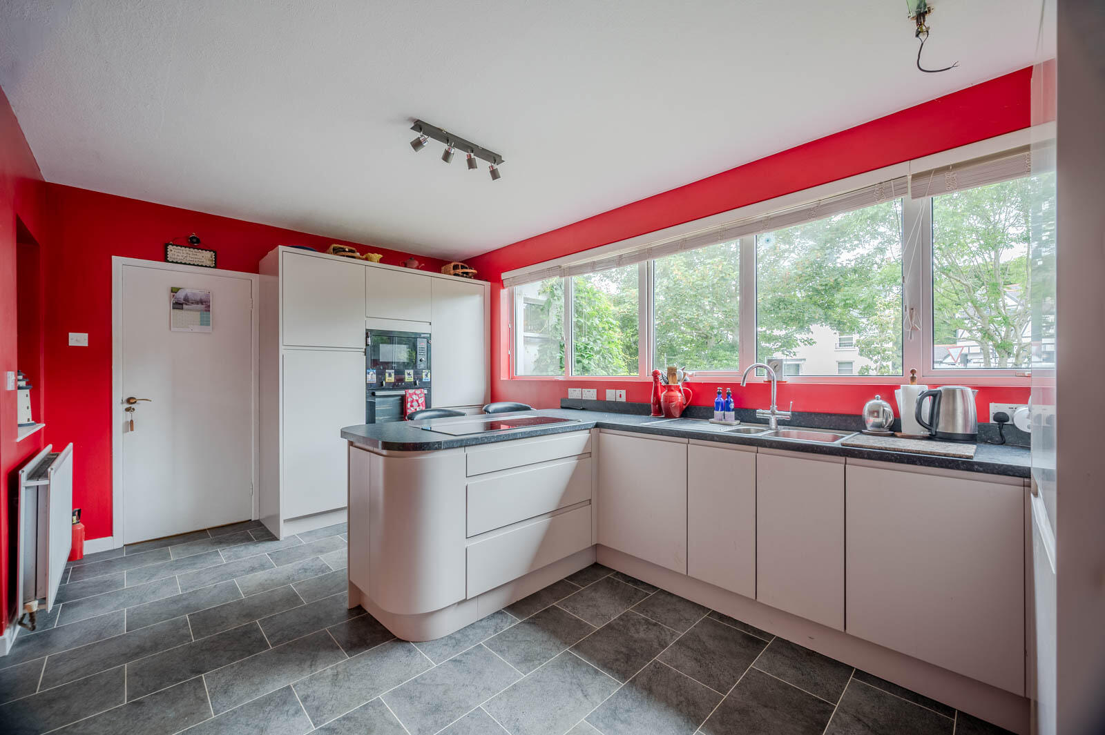 Kitchen - 5.11m x 3.10m (16'9 x 10'2) - Handleless bespoke fitted kitchen, excellent range of high and low level units, built-in pantry cupboards with drawer units, carousel corner units x two, stainless steel single drainer sink and a half sink unit, chrome mixer taps, Franke boiling tap, peninsula with built-in casual dining/breakfast bar, four ring hob and recessed stainless steel recycling extractor fan, integrated high level microwave and oven, integrated high level fridge and integrated dishwasher, Karndean tiled flooring, beautiful mature outlook to front gardens and brick paviour driveway, glazed double doors to dining room. Access to rear hallway, utility room and access to garage.