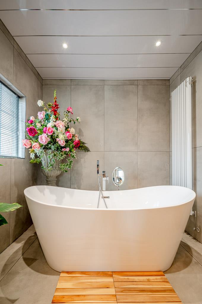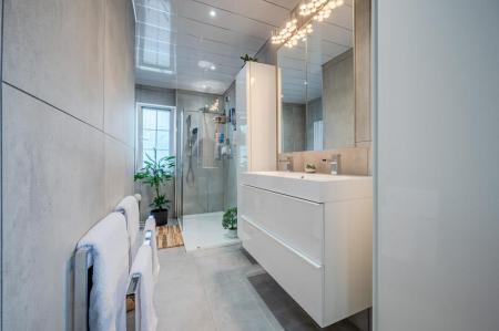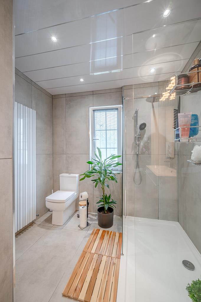 Family Bathroom: - () - Modern white suite comprising low flush WC with push button, vanity unit with chrome mixer taps, corner shower unit with thermostatically controlled valve, telephone hand unit and rainfall shower head, free standing bath with chrome mixer taps and telephone hand unit, ceramic tiled floor, fully tiled walls, uPVC tongue and groove ceiling with low voltage recessed spotlighting, modern vertical radiator x two.
