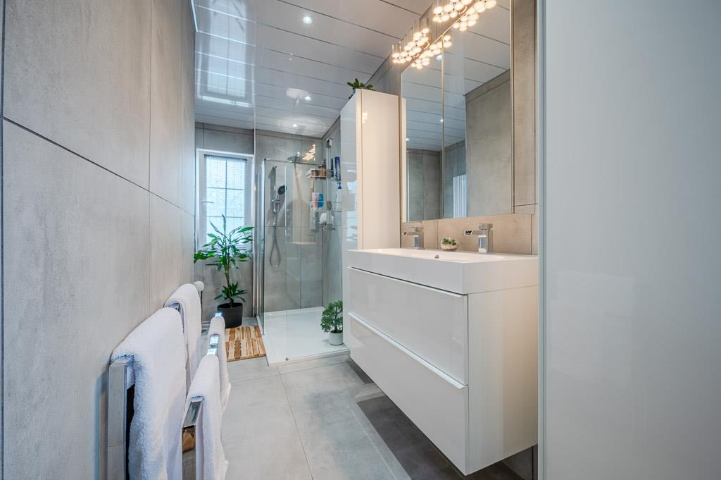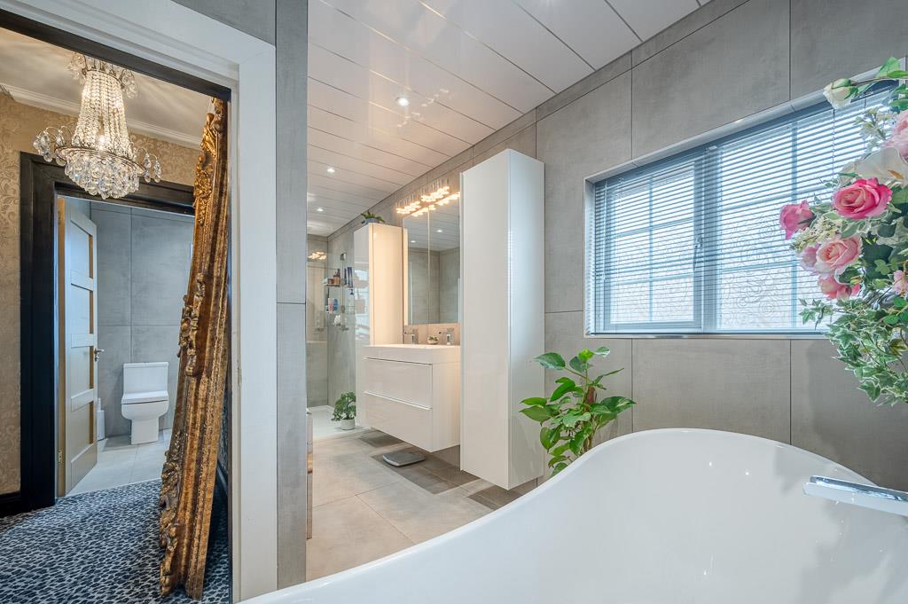 .Spacious Fitted Family Bathroom with Modern White Suite Comprising of Both Bath and Shower Facilities