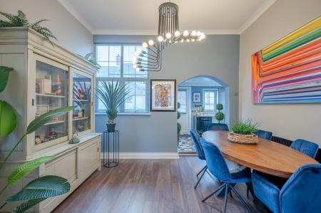 Family Room: - (4.67m x 4.09m) - Laminate wooden floor, picture rail, cornice ceiling, Opus wood burning stove with tiled hearth, leading to dining room through archway.