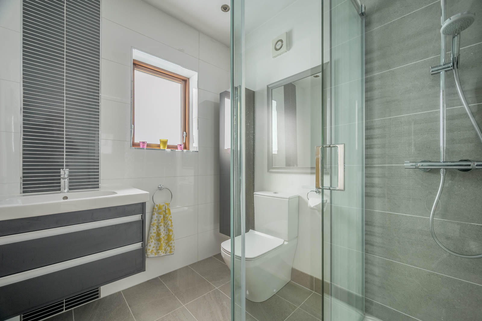 En Suite: - With fully tiled shower cubicle, thermostatic shower with handheld attachment, one floating built-in tall cabinet and one free standing tall cabinet, vanity unit with chrome mixer tap and drawers, low flush WC, chrome heated towel rail, tiled floor, partial tiled wall, extractor fan.
