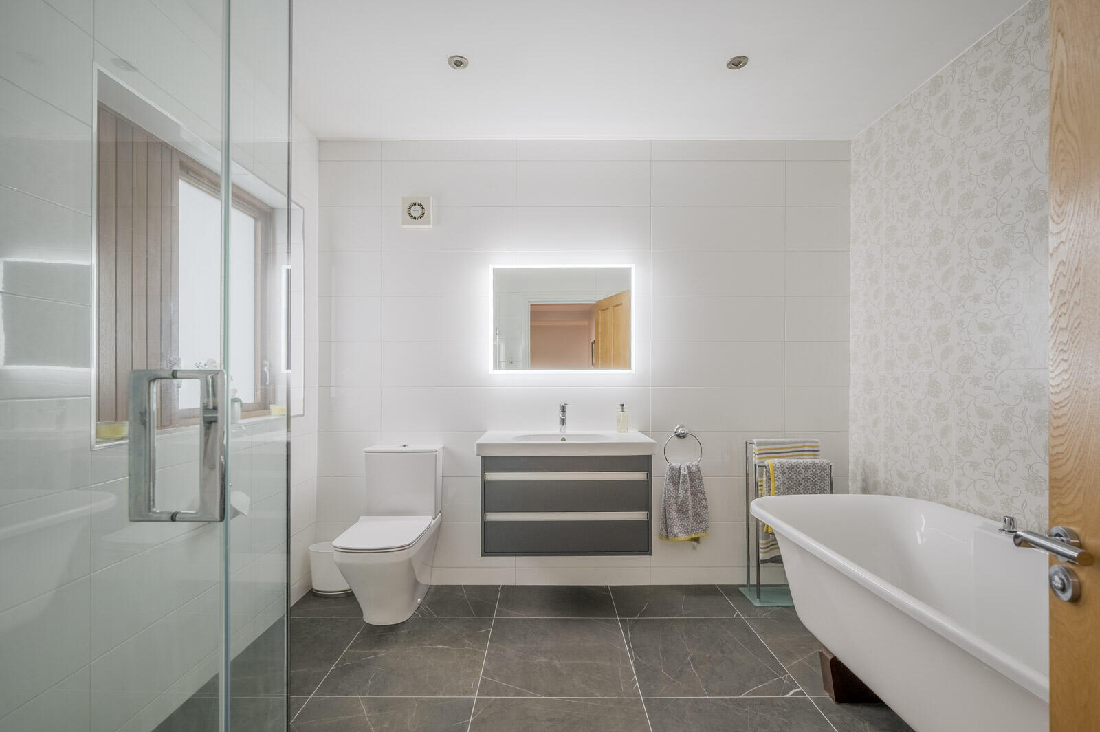 Modern Bathroom: - With white suite comprising free standing ceramic bath with chrome mixer taps and shower attachment, fully tiled shower cubicle, handheld attachment, low flush WC, vanity unit with chrome mixer taps and drawers, fully tiled walls.
