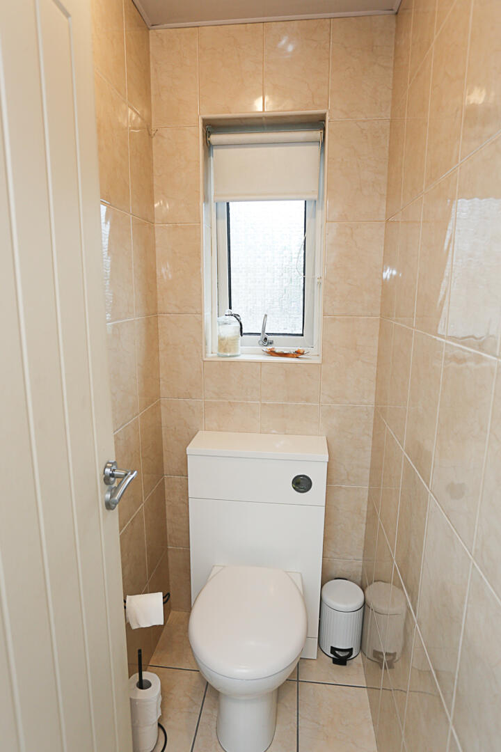 Separate Wc - With low flush WC, tiled walls, tiled floor.