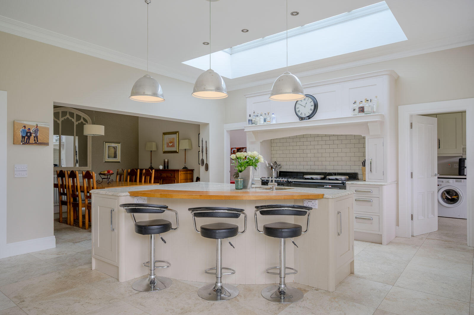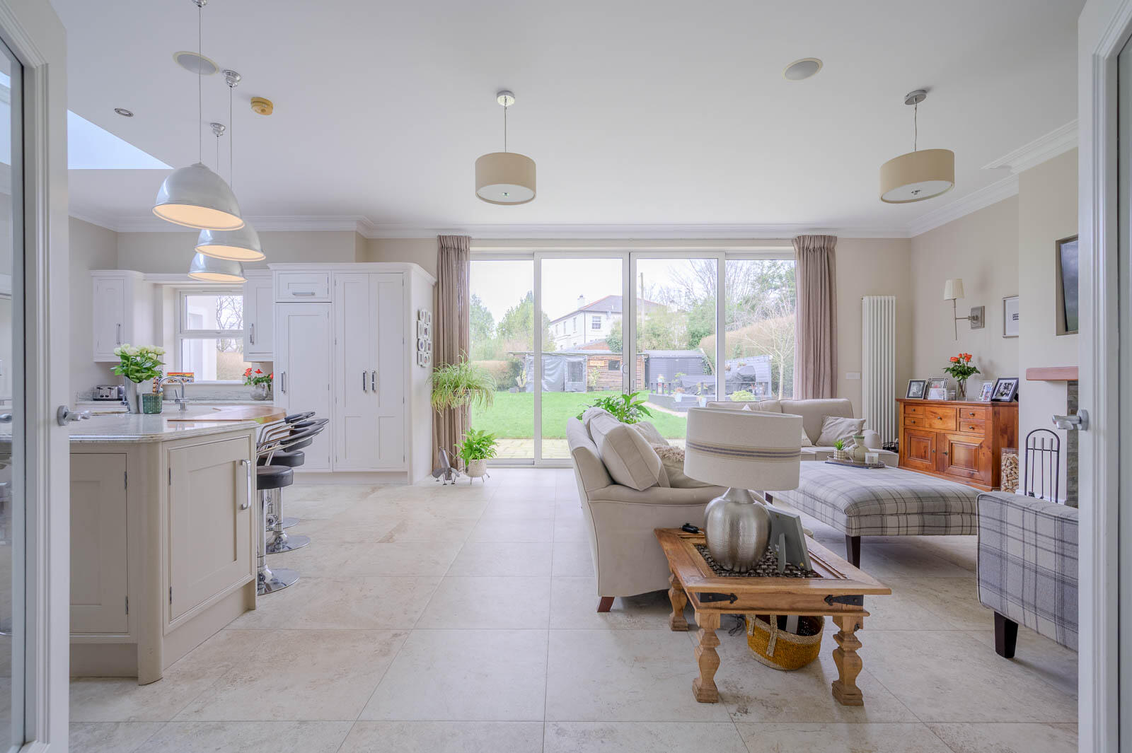 .Impressive open-plan kitchen, dining and living space to the rear, designed to maximise natural light with extensive glazing and overhead roof lights.