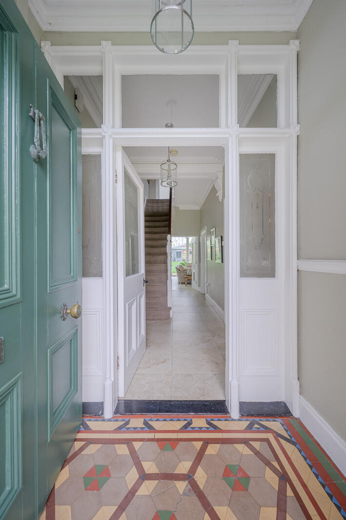Victorian Original Tiled Front Porch: - Cornice ceiling, original glazed and etched inner door, matching side lights and glazed top light.