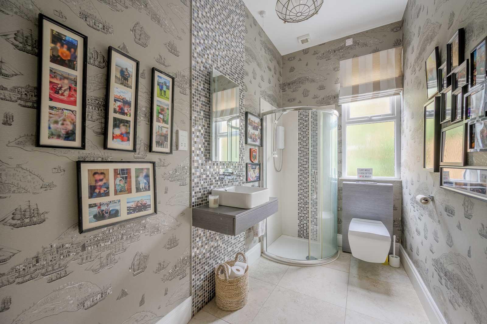 Ground Floor Shower Room / Wc And Cloakroom: - With contemporary white suite comprising close coupled WC, floating wash hand basin with wall mounted chrome mixer taps, mosaic floor to ceiling tiled splashback, illuminated mirror, built-in porcelain tiled shower cubicle with mosaic inset detail, electric shower unit, heated towel rail, excellent cloaks storage, travertine/porcelain tiled floor, cornice ceiling.