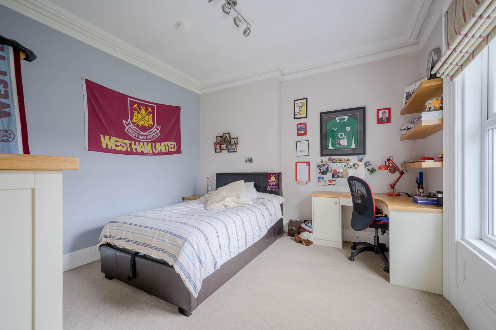 Bedroom Three: - 13'2" x 11'6" - Cornice ceiling, mature outlook to front gardens and Cyprus Avenue, corner built-in study desk with hardwood worktop, drawer unit and cabinet, floating shelving.