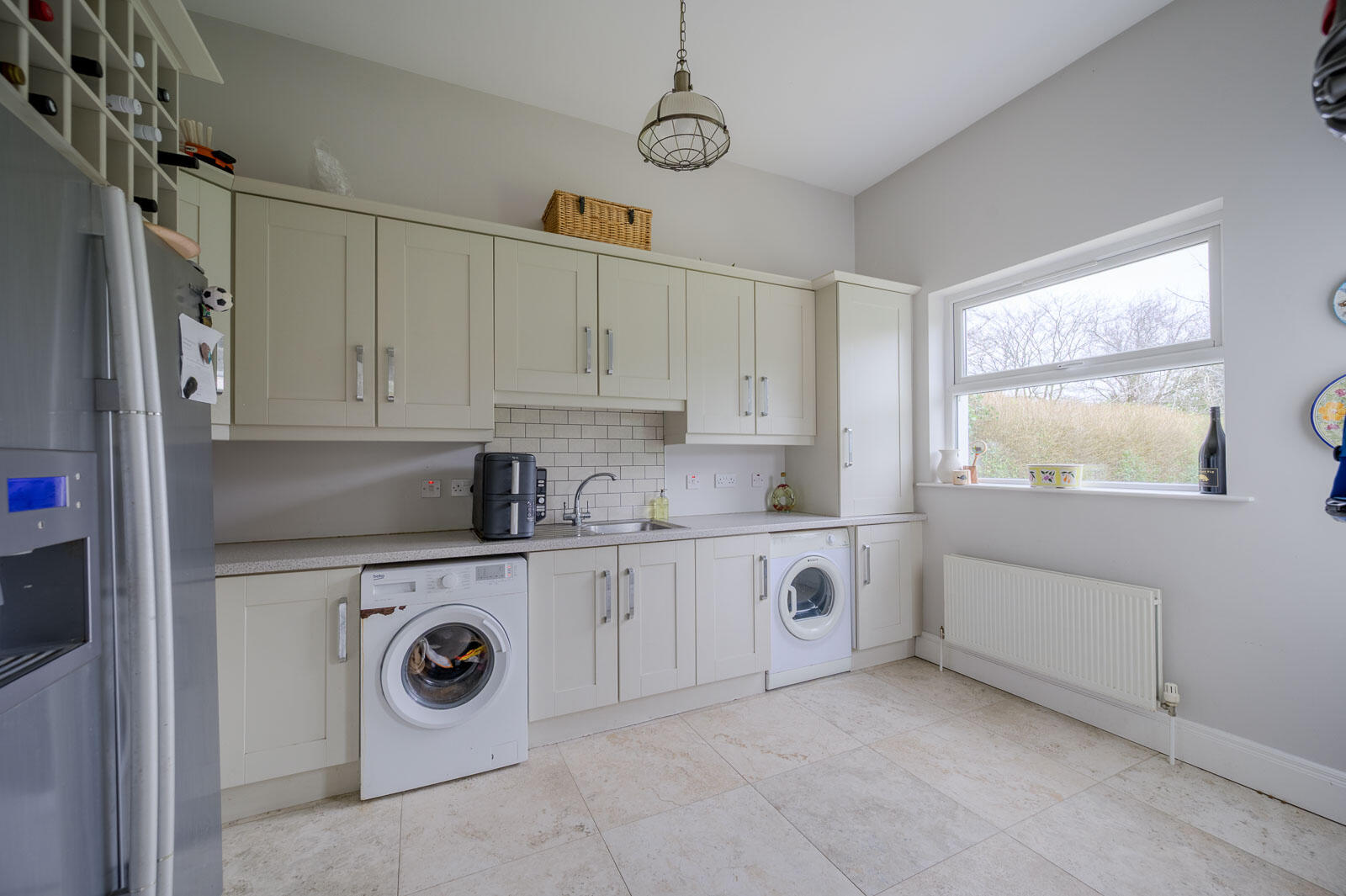 Separate Utility Room: - 13'7" x 9'9" - Separate generous utility room with matching range of high and low level units, chrome fittings, laminate granite effect work surface, single drainer stainless steel sink unit, chrome mixer taps, plumbed for washing machine, space for dryer, concealed Baxi gas fired boiler, housing and plumbing for American style ice making fridge freezer, built-in wine rack above, additional built-in storage cupboards, continued travertine/porcelain tiled flooring, outlook to rear garden and uPVC double glazed access door to rear patio and garden.